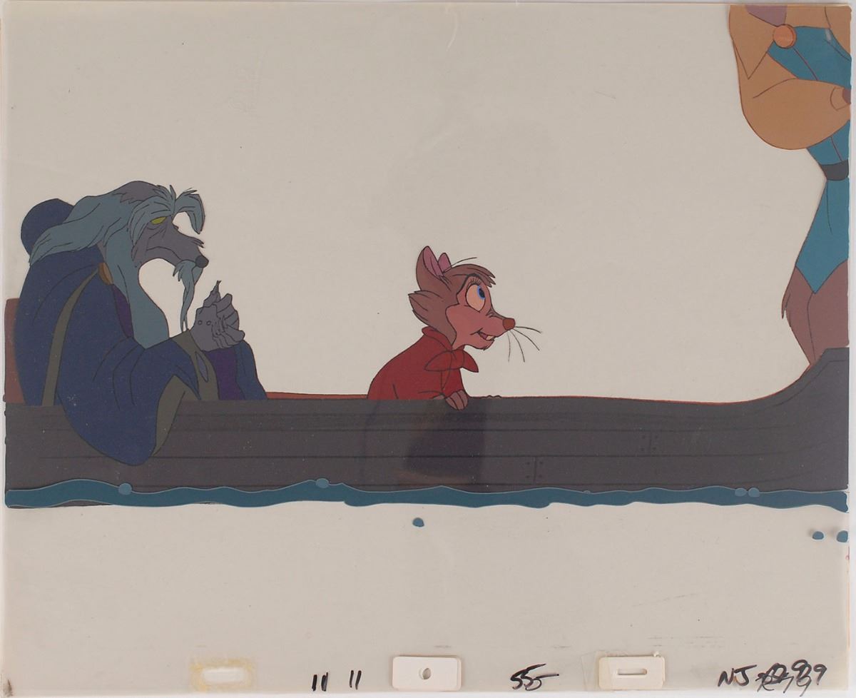 (Don Bluth Studios, 1982) Original production cel and production background featuring Mrs. Brisby and Nicodemus from The Secret of Nimh, showing the pair being ferried deep inside the rose bush. The cel is placed on a matching production overlay background. Character images measure from 3 x 3 to 2.5 x 7, with a total image size of 16.5 x 9.5, and overall dimensions of 16.5 x 13.5. In fine condition, with a thin cut to top edge of second cel and trivial soiling.