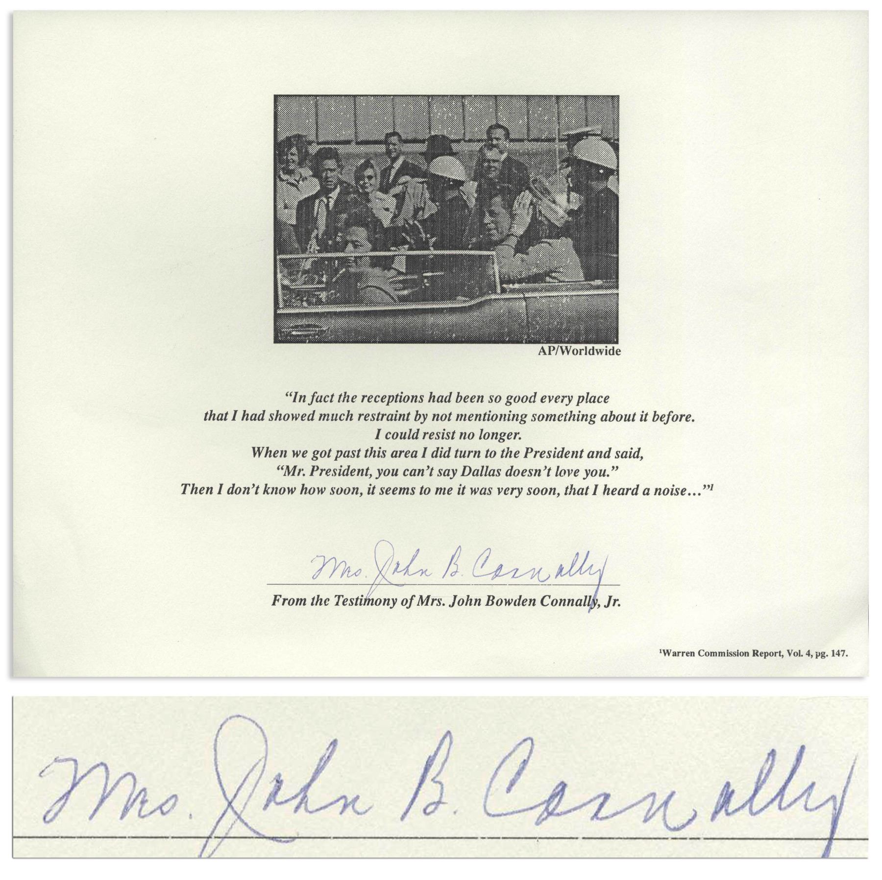 Mrs. John B. Connally signed statement regarding her last conversation with President John F. Kennedy in the presidential limousine, as told by her to the Warren Commission. The wife of Texas Governor John Connally, she and her husband rode with JFK and Jackie through Dallas, and here recounts the ironic words spoken to the President, ''...'Mr. President, you can't say Dallas doesn't love you.' Then I don't know how soon, it seems to me it was very soon, that I heard a noise...[signed] Mrs. John B. Connally''. Single page measures 11'' x 8.5''. Near fine condition.