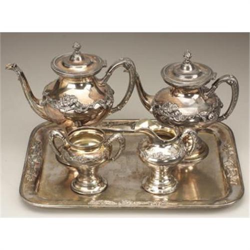 <B>Mrs. Mary Ann Montgomery, (General) Forrest's Antebellum Silver Service</B></I> Nathan Bedford Forrest, the great cavalier of the Confederacy was as heroic before the war as he was during it. The day he met his future wife Mary Ann Montgomery, he rescued the young lady and her mother from a broken down carriage in the middle of a stream and proceeded to thrash a group of young men who were harassing the two Southern belles.<BR>This five-piece silver service was owned by Mary Ann's parents and was willed to General and Mrs. Nathan Bedford the Forrests after their deaths. Monogrammed with the 'M' for Montgomery, the service was manufactured by Superior Silver Service, is quadruple plated and each piece is serial numbered 4091. The service includes a 10” coffee and 8” tea pots, creamer and sugar bowl resting on a 13” x 16” tray. Each piece incorporates a floral design with scrollwork handles.<BR><B>Condition: </B></I> Unpolished, approximately 30% loss of plating.<BR><B>Provenance:</B></I> <I> The Forrest Family, Memphis, Tennessee; Private Collection.</B></I><BR><B>Exhibited: </B></I><B><I> </B></I></B></I><I>Lot 2House Museum, Franklin, Tennesse.</B></I><BR><BR><b>Shipping:</b> Hollowware/Pottery/Glass, Large (<a target="_blank" href="http://www.heritageauctions.com/common/shipping.php">view shipping information</a>)