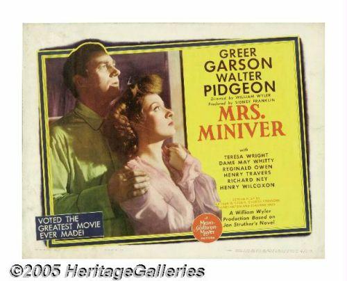 <B>Mrs. Miniver (MGM, 1942).</B></I> Half Sheet (22" X 28"). William Wyler directed this story of an English family during the early months of World War II and how the war affects their life on the home front. The film won Oscars for Best Picture, Best Director (Wyler) and Best Actress (Greer Garson). There is slight soiling, light creases and corner pinholes on the borders, and minor wrinkles and scuffs in the graphics. Fine+.