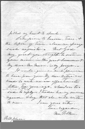 Mrs. Polk. Widow of the 11th President. A.L.S., Nashville, Tenn., Nov. 5, 1859, 2 pp., to Mrs. Mason. "Permit me to express my sincere and deep sympathy in the great loss you have sustained in the death of your much beloved and distinguished husband. I know that sympathy, tender as it is felt...must be ineffectual...but the memory of the past has recalled to my mind, private friendships and events, which associated your honored husband with the life of my own dear lamented, has filled my heart to speak ...that God may grant you strength to sustain your mind in the great bereavement, my dear Mrs. Mason, it is my prayer. It would give me much pleasure to hear from you...." Mrs. Polk recalls Mrs. Mason's letter to her ten years ago, "when I was too sad to reply" (on the death of Pres. Polk). The subject of this letter, John Mason, held two posts in Polk's Cabinet. Light original folds, else excellent.