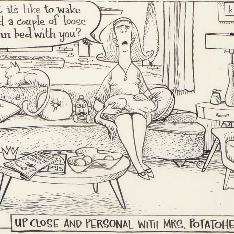 Enter a surreal and satirical world of twisted imagination and award winning creativity. "Mrs Potato Head" is an original pen & ink drawing on paper by Dan Piraro, creator of the critically acclaimed and award winning comic strip, Bizarro. This piece is h