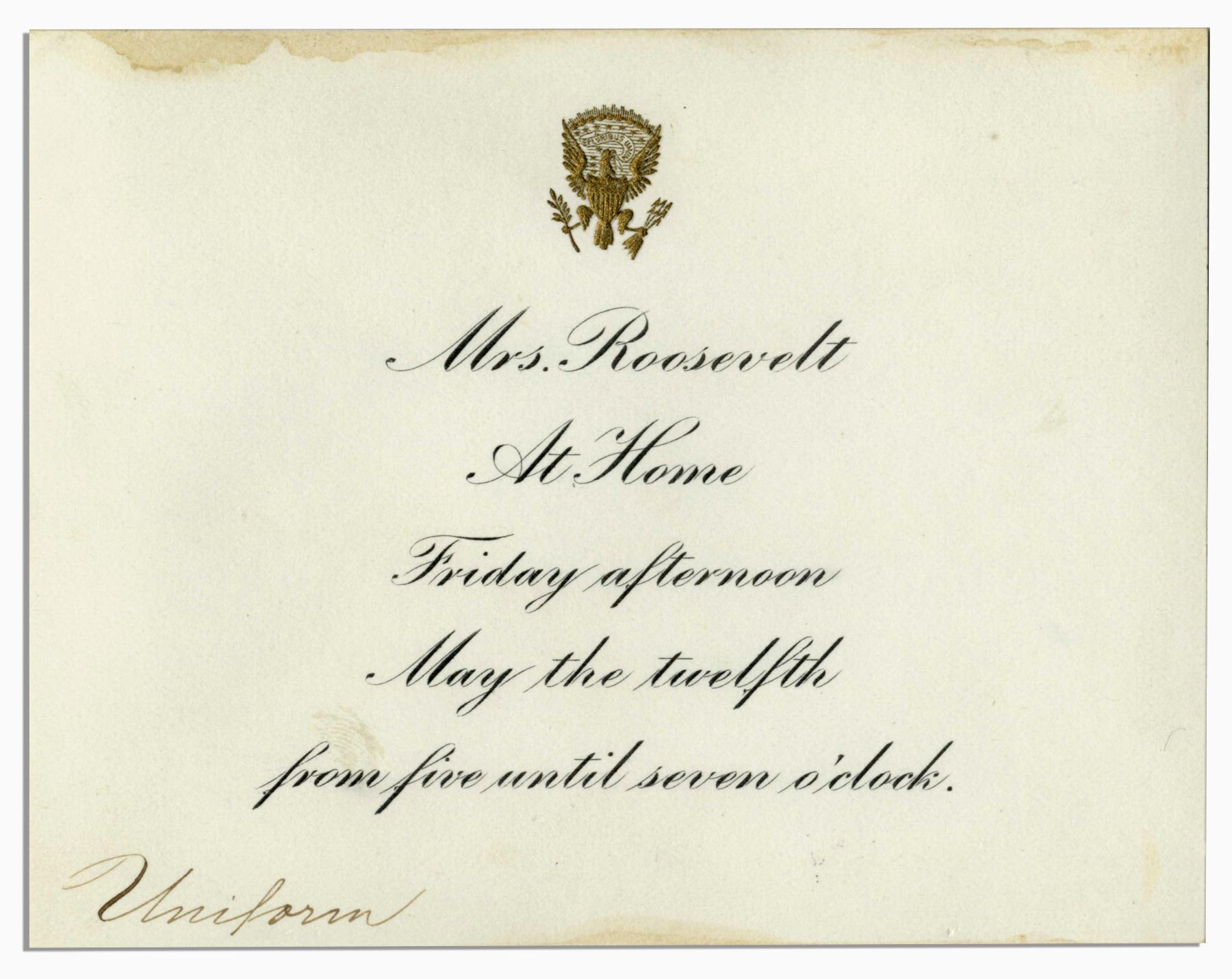 First Lady Edith Roosevelt invitation to a gathering held at the White House. Invitation contains a gilt embossed Presidential seal at top and reads in full, ''Mrs. Roosevelt / At Home / Friday afternoon / May the twelfth from five until seven o'clock / Uniform''. Measures 4.5'' x 3.5''. Some dampstaining along top. Very good.