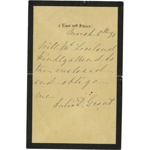 <B>Mrs. U. S. Grant Autograph Note Signed,</B></I> “<I>Julia D. Grant,</B></I>” one page on personal letterhead edged in black, 4” x 6.25”, New York City, March 5, 1890, recipient unknown. It reads, “<I>Will Wm Loveland kindly attend to the enclosed and oblige me.</B></I>” A large, bold signature of the former First Lady. Presumably the mourning border on this stationery denotes Mrs. Grant's widowhood. Browning, fine condition.<BR><BR><b>Shipping:</b> Flat Material, Small (<a target="_blank" href="http://www.heritageauctions.com/common/shipping.php">view shipping information</a>)