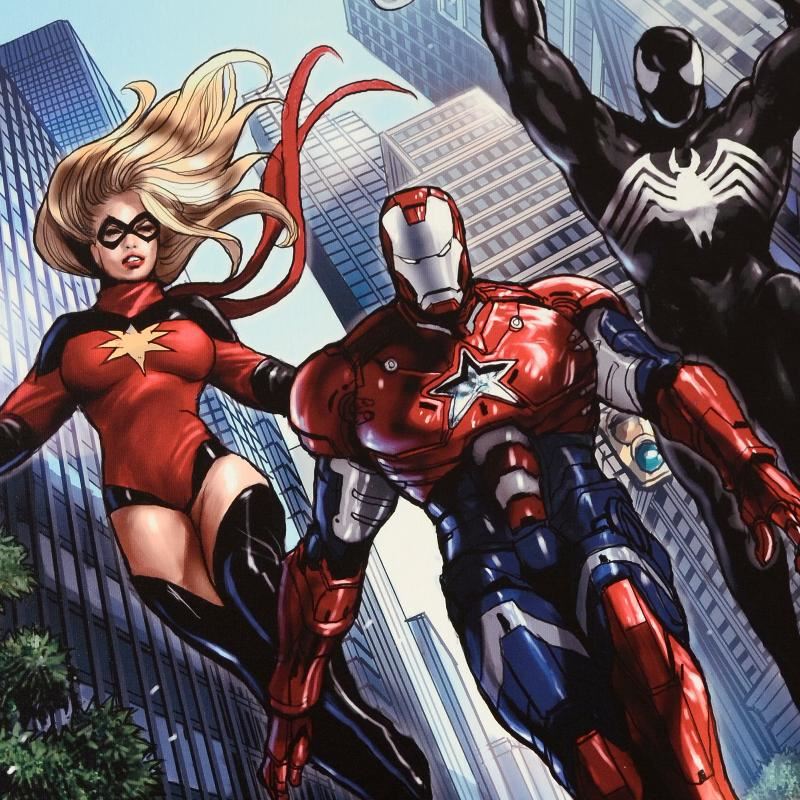 A piece of comic book history, this limited edition, from original art by Sana Takeda, depicts Iron Patriot, Wolverine, Hawkeye, Ms. Marvel, and Spider-Man. Sana Takeda is a Japanese artist who has worked on several American comics for Aspen, Image and Marvel. She has recently taken over pencilling, inking and coloring the internal and cover art for the Ms. Marvel comic series. "Ms. Marvel #44" is a limited edition giclee on canvas by Sana Takeda presented by Marvel Comics, numbered and hand signed by the great Stan Lee! Includes Certificate of Authenticity! Measures approx. 18" x 27" (image).