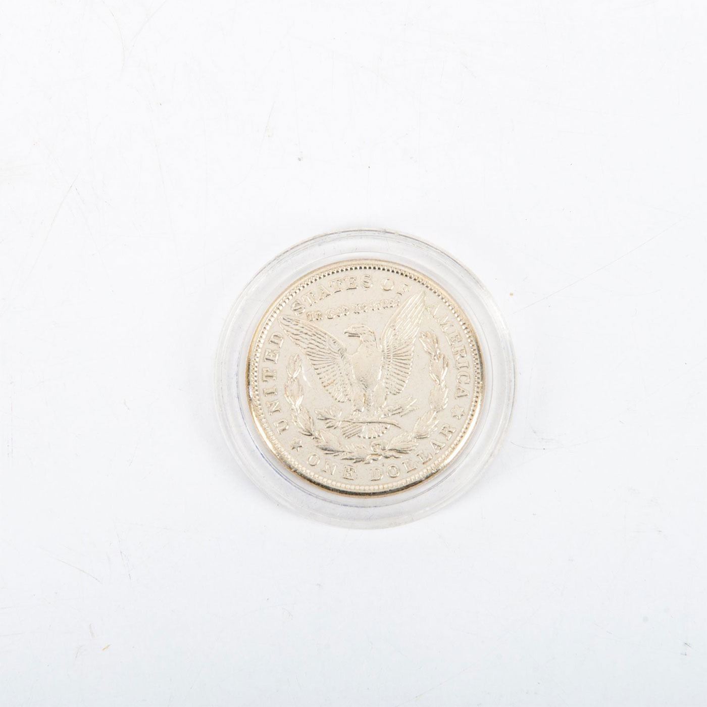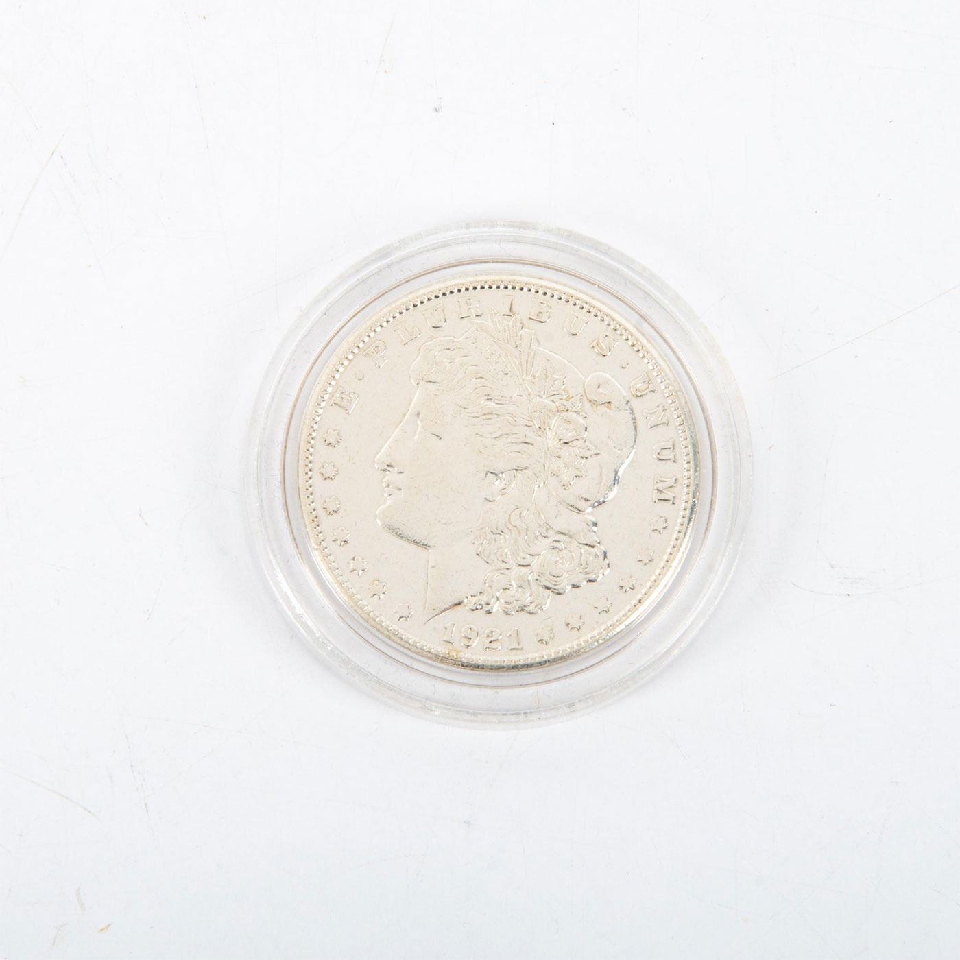 One early 20th century MS65 uncirculated silver dollar. This lot is for an MS65 uncirculated 1921 mint mark "S" Silver dollar coin. This is the last coin of the Morgan series (1878-1921). Designed by George T Morgan. Sealed in a see thru plastic case. Coins and Currency, Numismatists