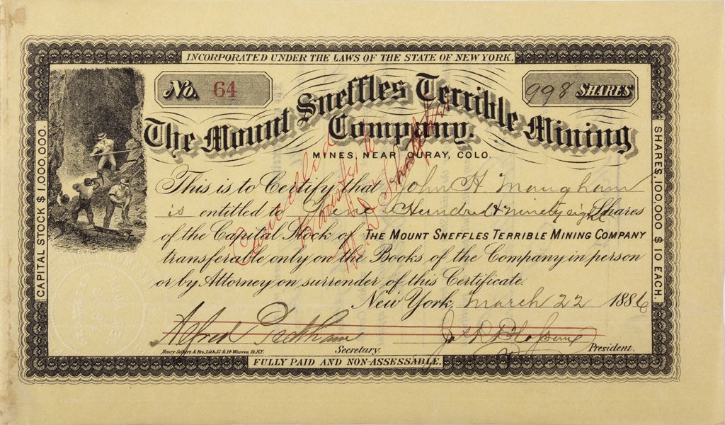 Incorporated in New York. Cert. #64, issued to John H. Maugham for 998 shares. Signed by Jos. R. Blossemp as president and Alfred Peckham as secretary. Cancelled written in red across face and by lines through signatures. Printer: Henry Siebert & Bros., New York. Founded in 1875, Sneffels had a peak population of 2000 people during its heyday from the mid-1880s to 1891. Located on the mountain of the same name, even getting there was hazardous--the road was treacherous and narrow and there were many rockslides and deaths. At one point a “Revenue Tunnel,” costing $600,000, was built to solve many of the problems at the mine, but to no avail. There are only scattered remnants today [Ref: www.ghosttowns.com/states/co/sneffels.html].City: Ouray CityCounty: Ouray CountyState: CO