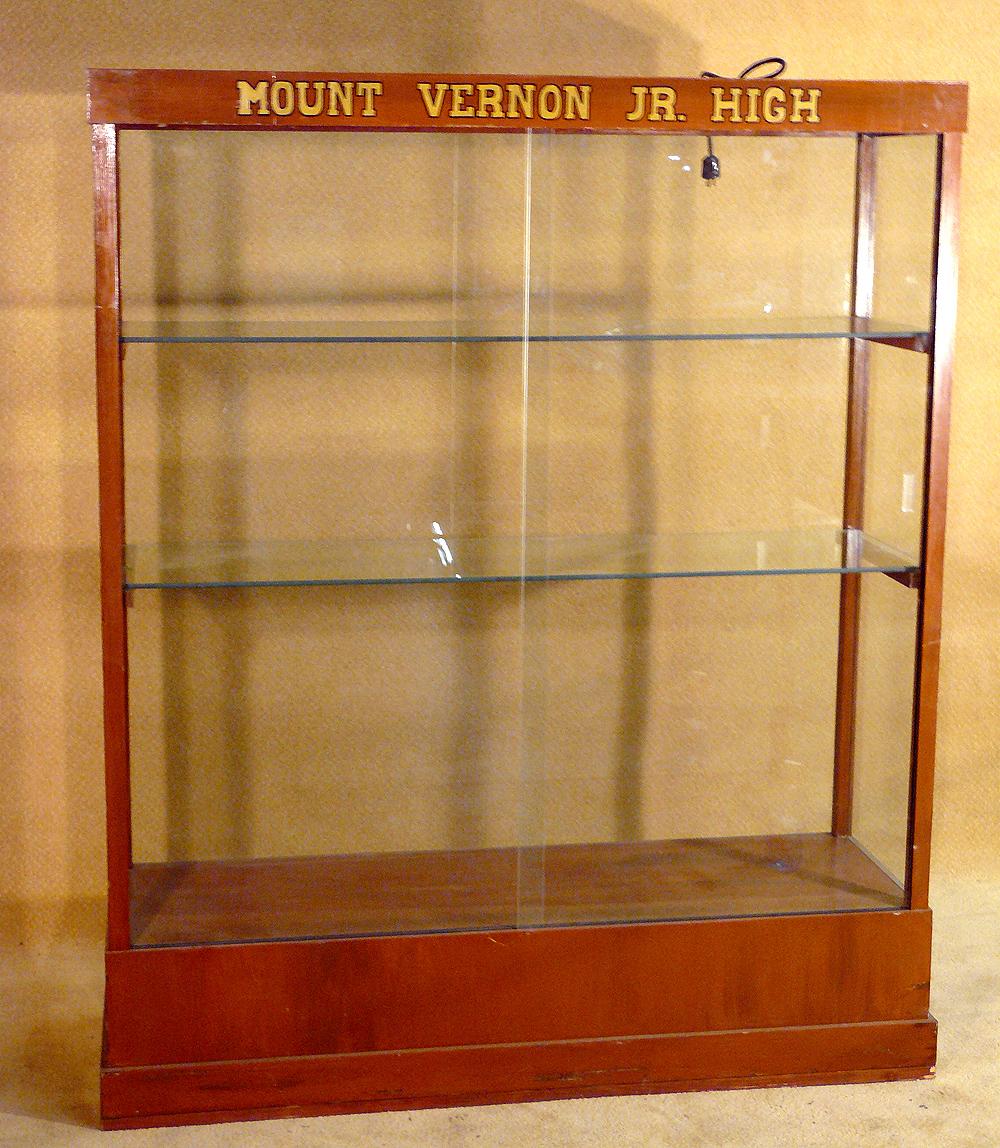 Trophy display case from Mt. Vernon Jr. High. Wood frame with glass sliding doors.
