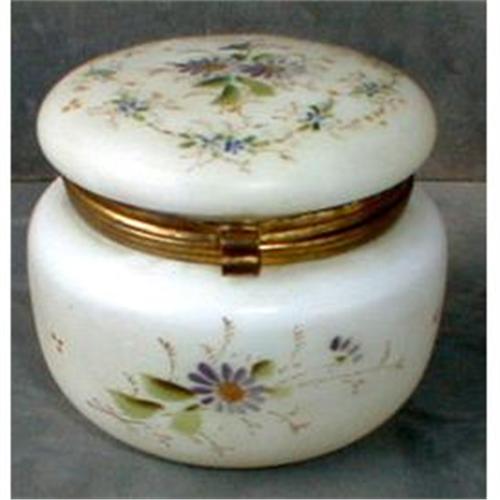 Beautiful satin glass powder jar with enamel decoration typical of Mt.