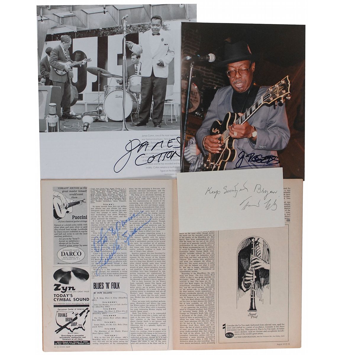 Four items signed by members of various incarnations of Muddy Waters’ seminal band in the 1950-60s: one issue of Down Beat magazine from 1967, signed inside in blue felt tip by piano player Otis Spann (1930-1970) and his wife, Lucille Spann (1938-1994); one color satin-finish 8 x 10 photo of guitarist Jimmy Rogers (1924-1997), signed in black felt tip; one 10 x 11.75 book photo of harp player James Cotton (b. 1935) on stage, signed in black felt tip; and one black ink signature and inscription by drummer Frances Clay (1923-2008) on an off-white 6.75 x 3.75 sheet. In overall fine condition.