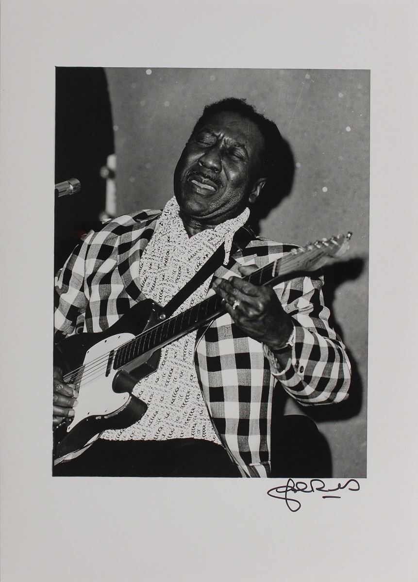 Fantastic glossy 14 x 19 photo showing Waters playing the blues on his Telecaster, signed in the lower border in black felt tip by photographer John Rowlands. In fine condition.