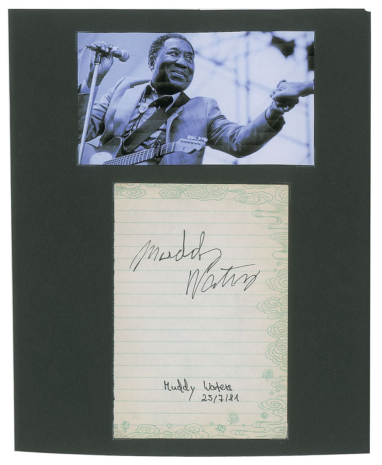 Ink signature, "Muddy Waters,” on an off-white 4 x 6 lightly lined sheet, with collector's notations dating the signature to July 25, 1981. Removably corner-mounted to a display sheet with an image of Waters with his guitar. In fine condition. Accompanied by a full letter of authenticity from REAL.