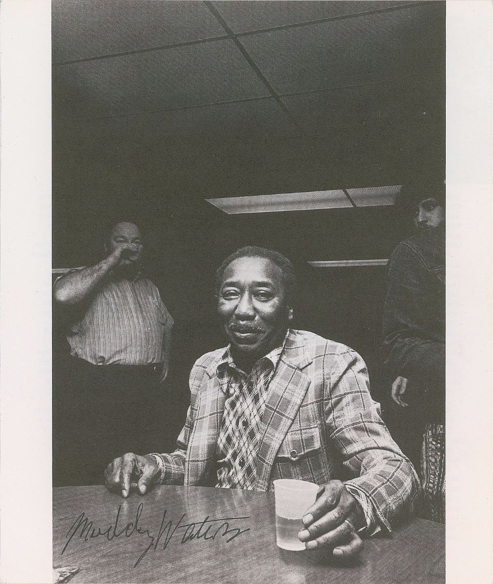 Uncommon 8.5 x 10 book photo of Waters drinking from a small cup, signed at the bottom in black felt tip. In fine condition, with neatly trimmed edges. The Larry Rafferty Collection.