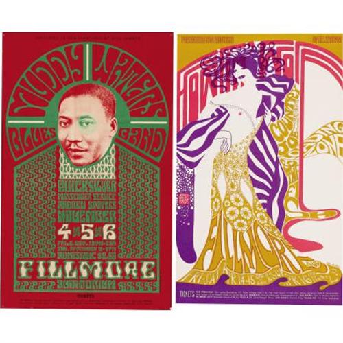 <B>Muddy Waters and Howlin' Wolf Fillmore Concert Poster BG-35 and BG-59 Group (Bill Graham, 1966-67).</B></I> Two giants of the Blues are represented by these two Bill Graham Presents concert posters. First, a second printing copy of BG-35, featuring Muddy Waters and Quicksilver Messenger Service, measuring approximately 13.75" x 22.5", in VG+ condition with tackholes in all corners, and one small corner tear. Second, a copy of the never-reprinted BG-59 featuring Howlin' Wolf, Country Joe and the Fish, and Loading Zone, measuring approximately 13.25" x 21.75, in NM- condition.<BR><BR><b>Shipping:</b> Flat Material, Large (<a target="_blank" href="http://www.heritageauctions.com/common/shipping.php">view shipping information</a>)