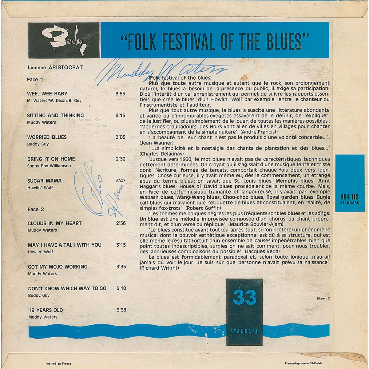 Folk Festival of the Blues album signed on the back cover in blue ballpoint, “Muddy Waters” and “Otis Spann.” In fine condition, with some scattered soiling, light ‘ring of wear,’ and slight peeling to the sleeve’s edge in the lower right corner. The record is included. An uncommon pairing of two influential blues legends.
