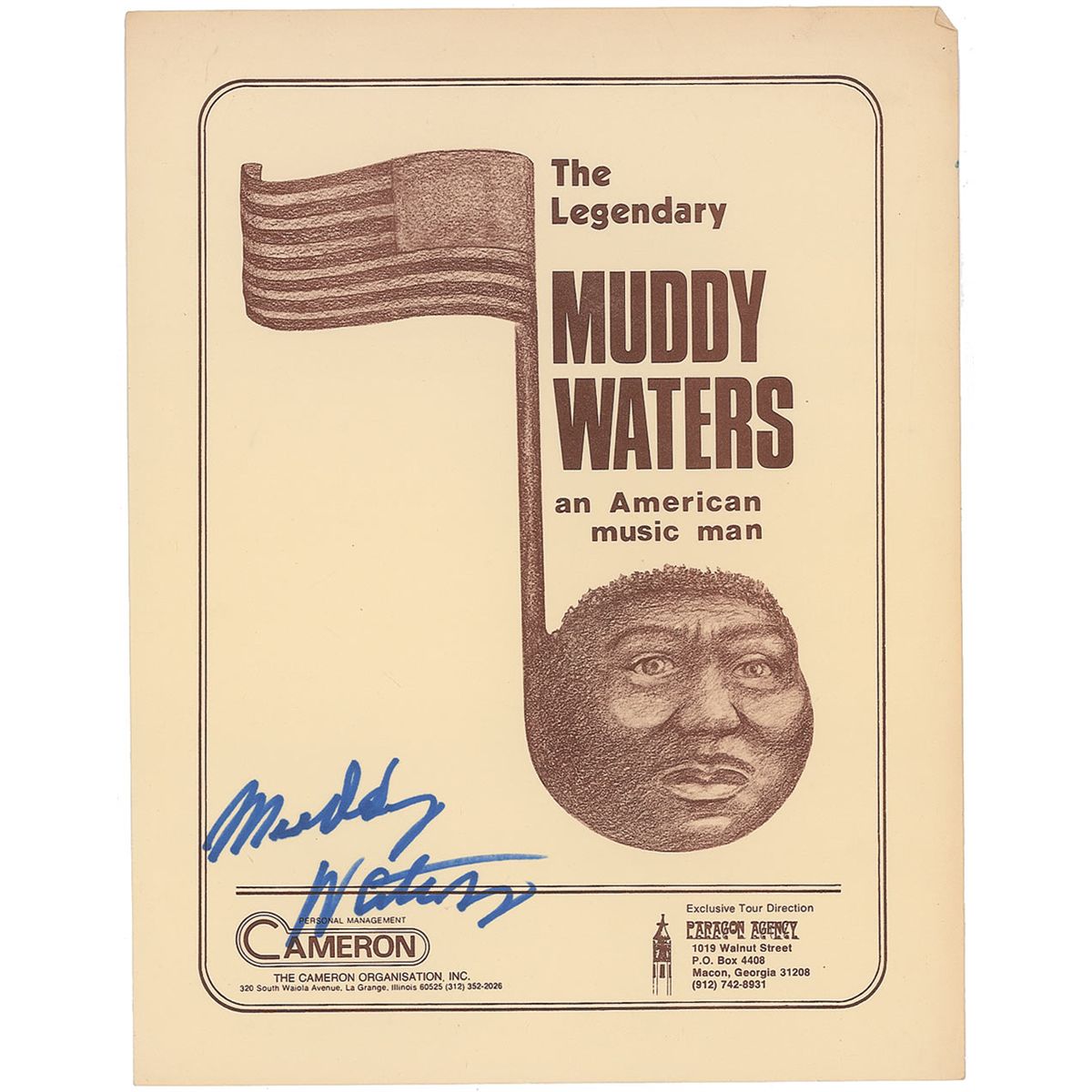 Promotional broadside for “Muddy Waters, An American Music Man,” 8.5 x 11, signed in blue felt tip by Waters. In fine condition, with a few light creases and some mild toning.