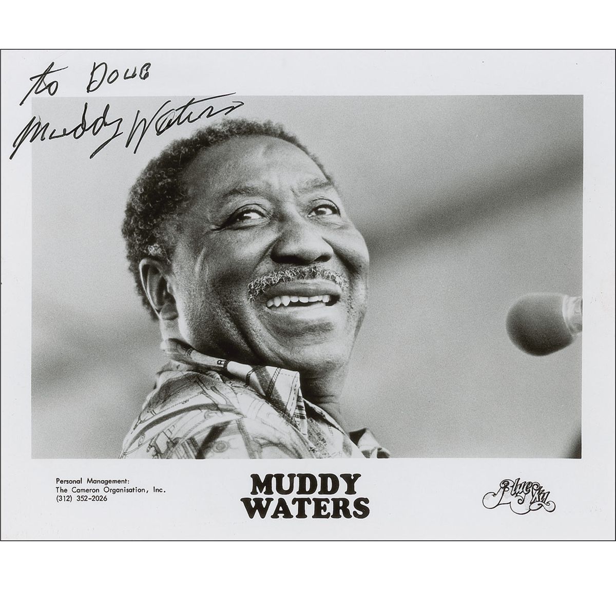 Glossy 8 x 10 publicity photo, signed and inscribed in black felt tip “To Doug, Muddy Waters.” In fine condition, with a few scattered light creases.