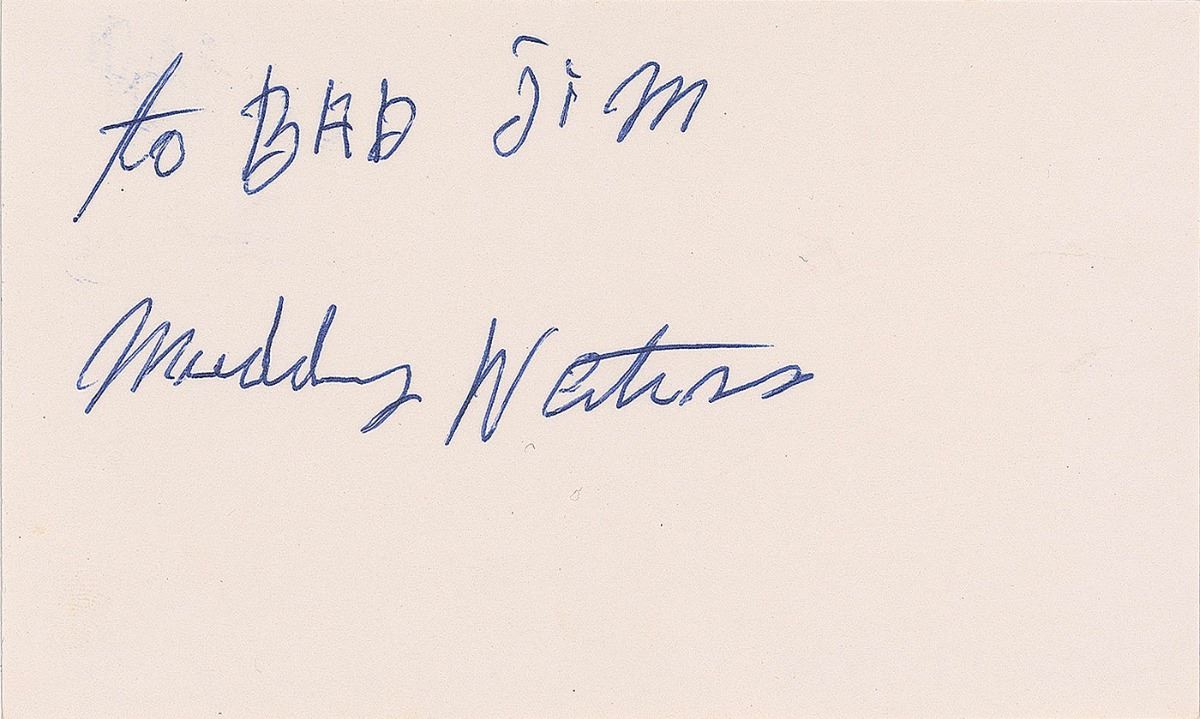 Ballpoint signature and inscription, “To Bad Jim, Muddy Waters,” on an off-white 5 x 3 card. Reverse bears a collector’s pencil notation dating the signature to January 17, 1978. In fine condition.