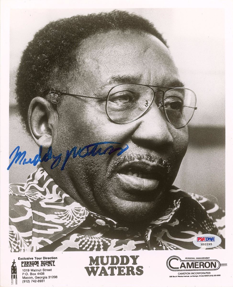 Glossy 8 x 10 Cameron Inc. publicity close-up photo of Muddy Waters, signed in blue felt tip. In fine condition. Accompanied by a full letter of authenticity from PSA/DNA.