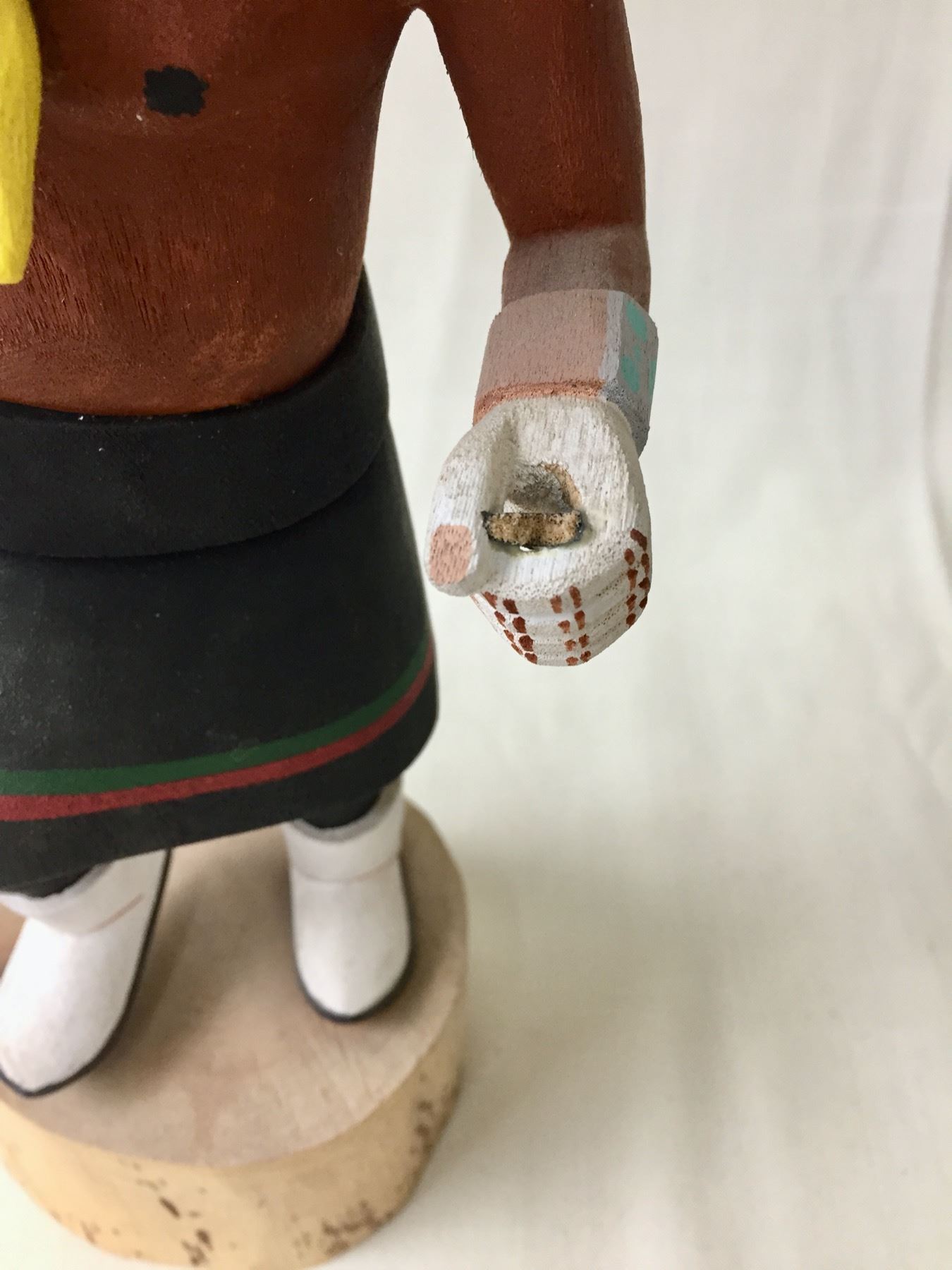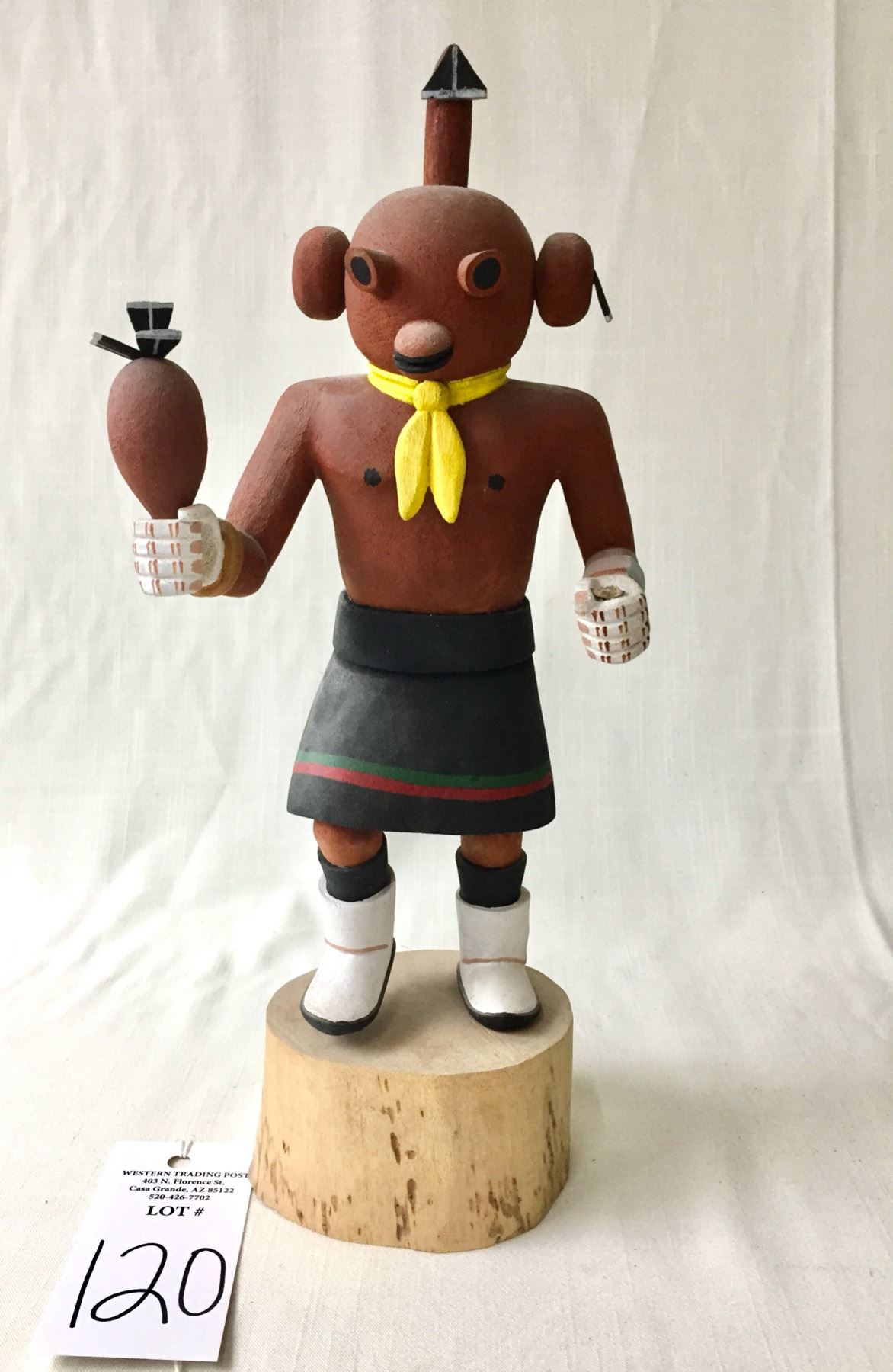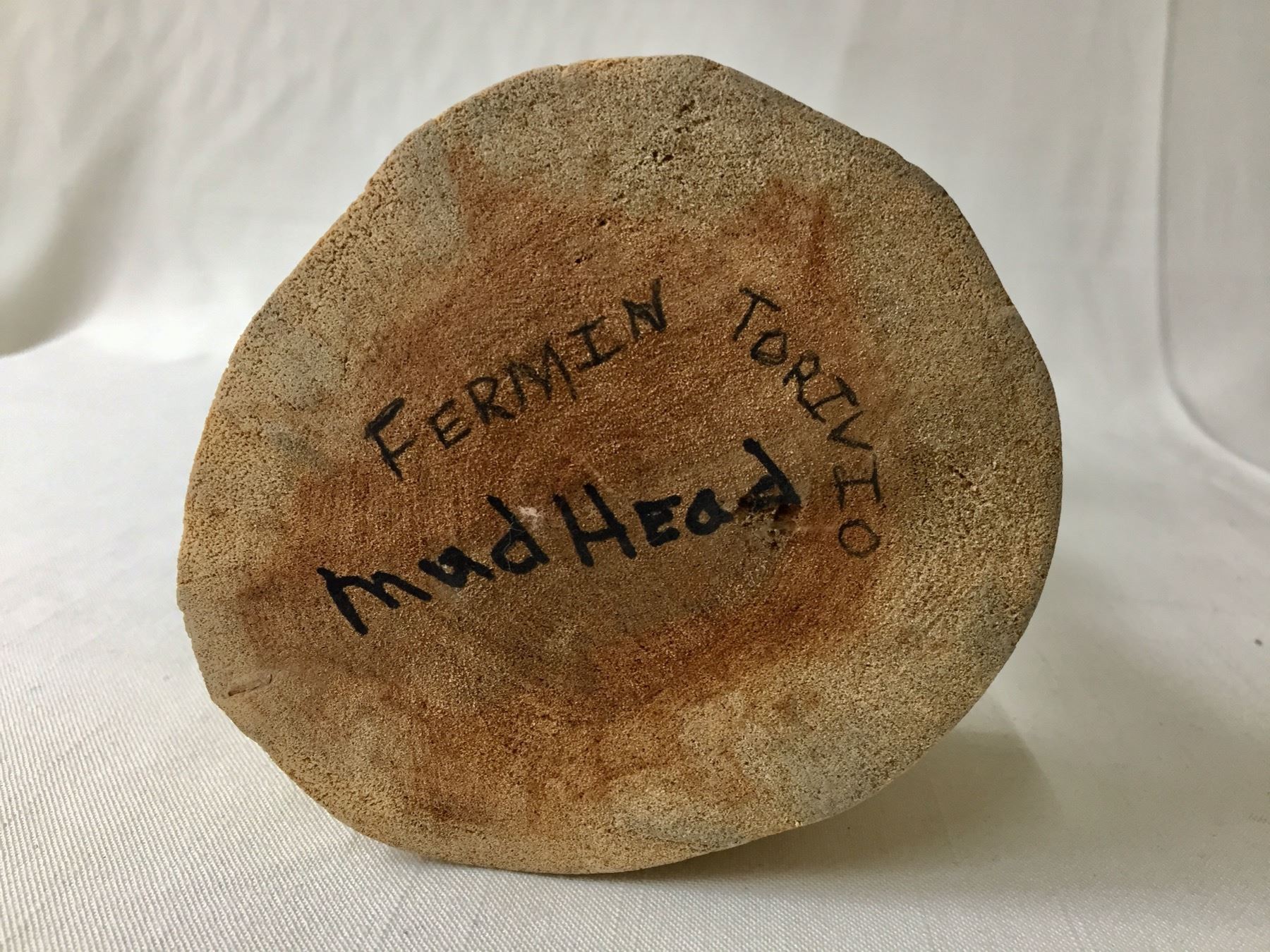 Description: Offered for sale in this lot is a Mudhead Kachina. It does have a broken piece in the hand and feather on his ear. Otherwise, this is beautiful handmade and hand painted Kachina. Maker: Fermin Torivio, Hopi. Approx. Age: Fairly modern. Size: 13-3/4 inches tall x 6 inches wide. Condition: Good for its age, normal wear expected. Please look closely at the pictures - they are an important part of our description. Shipping: There will be a $8 handling, packaging fee for shipping this lot. The actual cost of postage will be added on top of that.