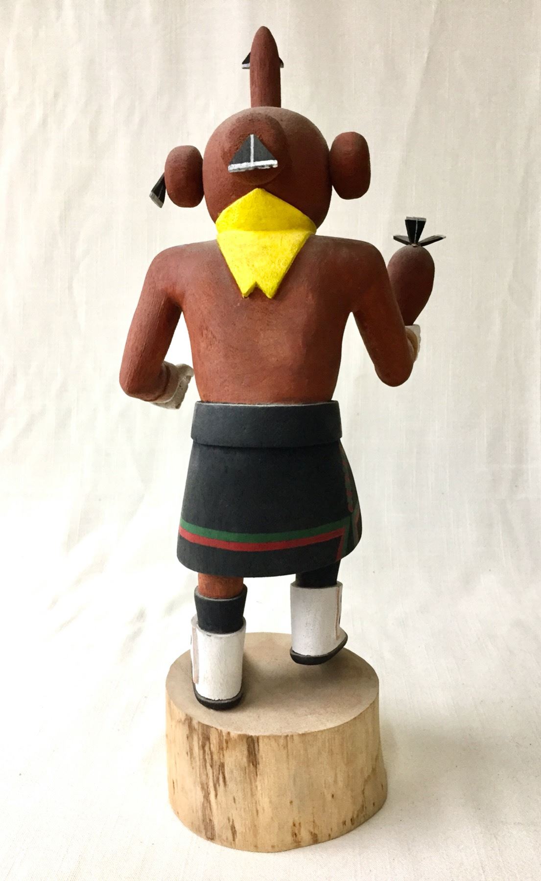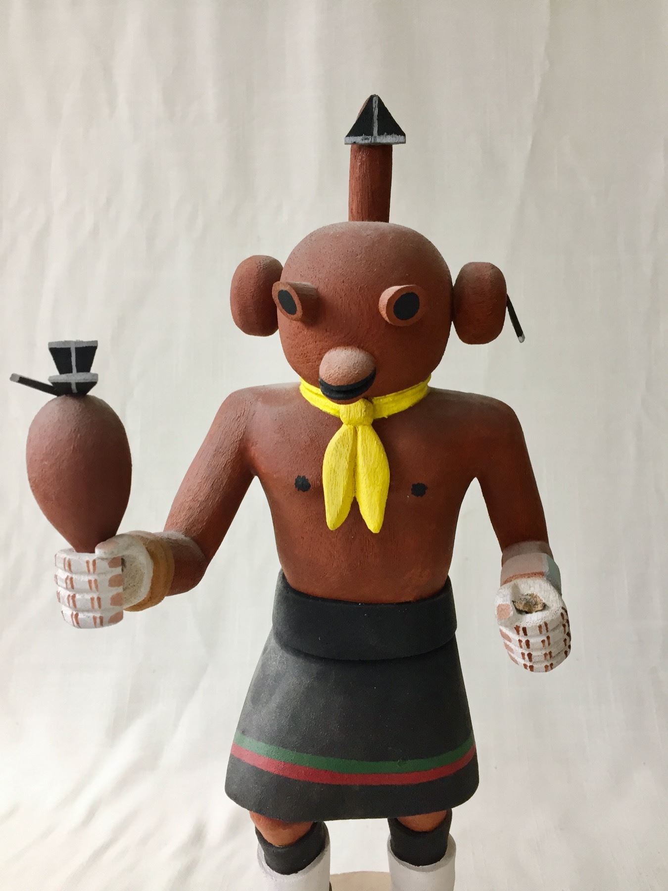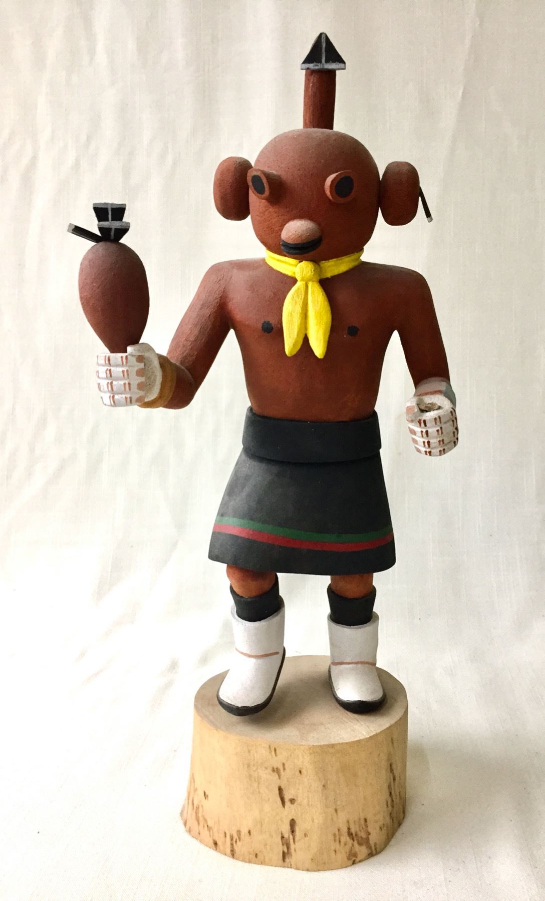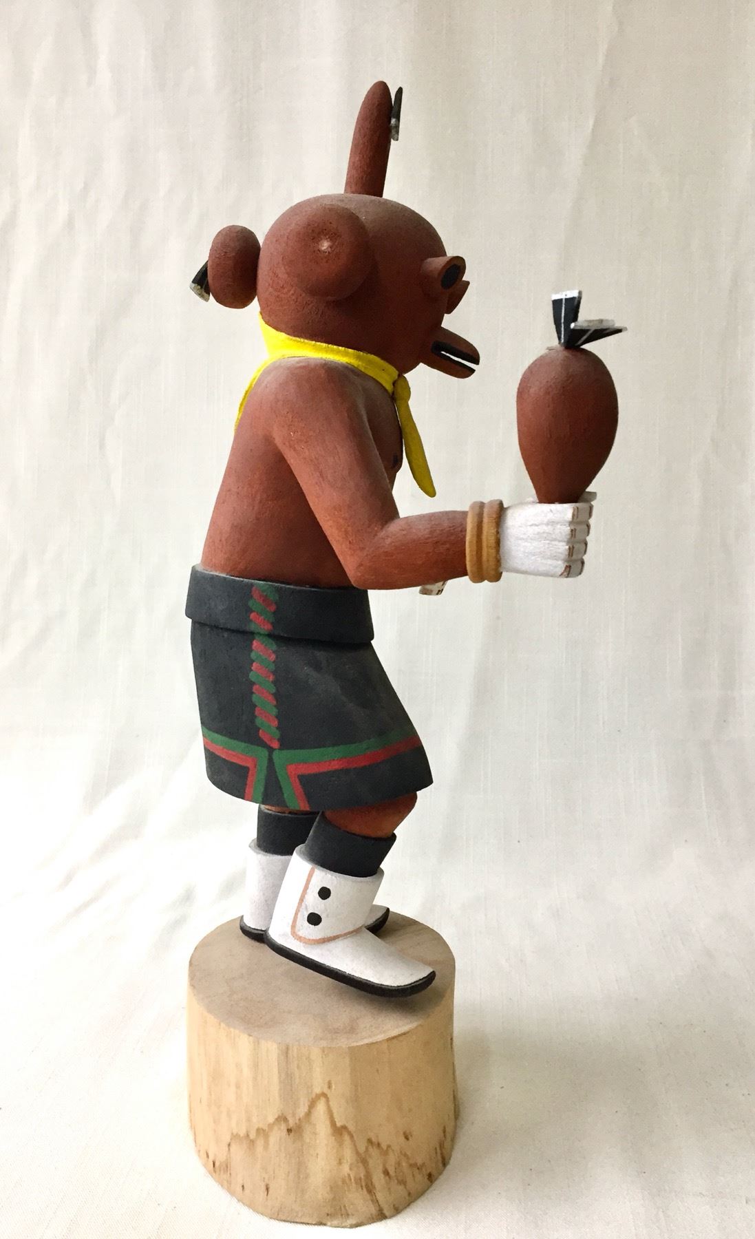 Description: Offered for sale in this lot is a Mudhead Kachina. It does have a broken piece in the hand and feather on his ear. Otherwise, this is beautiful handmade and hand painted Kachina. Maker: Fermin Torivio, Hopi. Approx. Age: Fairly modern. Size: 13-3/4 inches tall x 6 inches wide. Condition: Good for its age, normal wear expected. Please look closely at the pictures - they are an important part of our description. Shipping: There will be a $8 handling, packaging fee for shipping this lot. The actual cost of postage will be added on top of that.