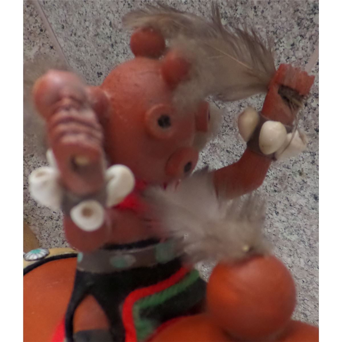 Great 1940's Mudhead Kachina with child on back. Kachina is signed Chapella (with Lizard and Sand drawing on the bottom) Please see pictures. The Kachina has minor nicks. This item is highly decorated with shells, feathers, leather and cloth. Minor chips and scratches. Shipping $22.00