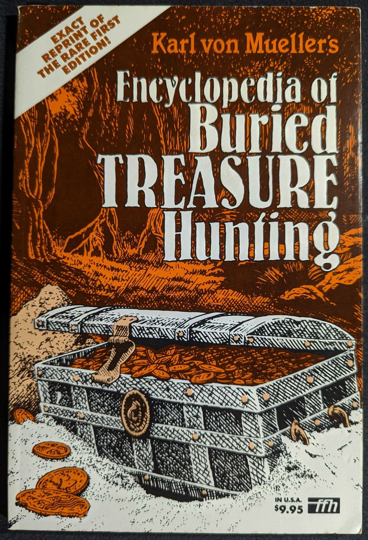 Mueller, Karl von. THE ENCYCLOPEDIA OF BURIED TREASURE HUNTING. THE BLUE BOOK OF TREASURE HUNTING. Books of Adventure. 1990. 12mo. (2), 88 pages. San Francisco. facsimile reprint of the scarce 1965 first edition. original pictorial card covers. Fine. In this book, 'The Old Man' (although he wasn't quite so old when this was written in the mid-1960's!) covers treasure hunting from Aaron's Express (a book he wrote about several times, that no bibliophile has been able to locate) to 'zigafoos' ('a charm or talisman carried by professional treasure hunters for the purpose of identification or recognition'). It's all here as precise, concise entries: lost mines, famous buried treasures, treasures found, organizations, books, magazines, metal detector manufacturers (remarkable how almost all are now out of business), and much more. This book is a remarkable insight into the shadowy world of professional treasure hunting. A very different world of the 1950's and 1960's. Includes the publisher's select bibliography. Very scarce.