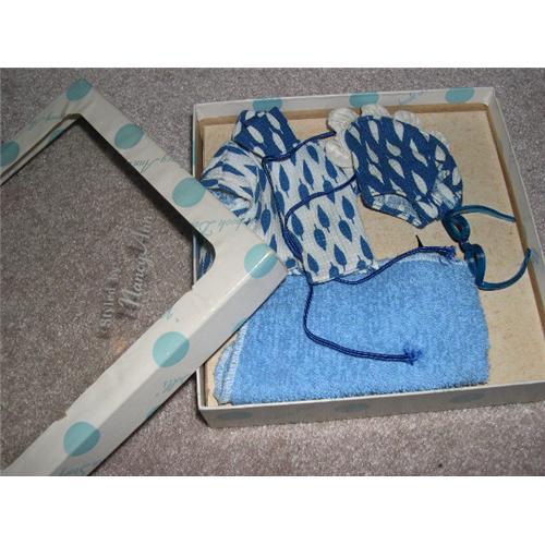 There is a see through lid with Styled by Nancy Ann printed on it in one corner. There is a suit with blue cord ties, a cotton jacket, a blue terry cloth towel and a pair of blue cateye glasses.The towel has a little piece of elastic on one corner. Outfit has not been on a doll. It is from a smoke free environment. If you can use it, please bid. Buyer to pay $10 for shipping, insurance, and handling. Thanks for viewing.