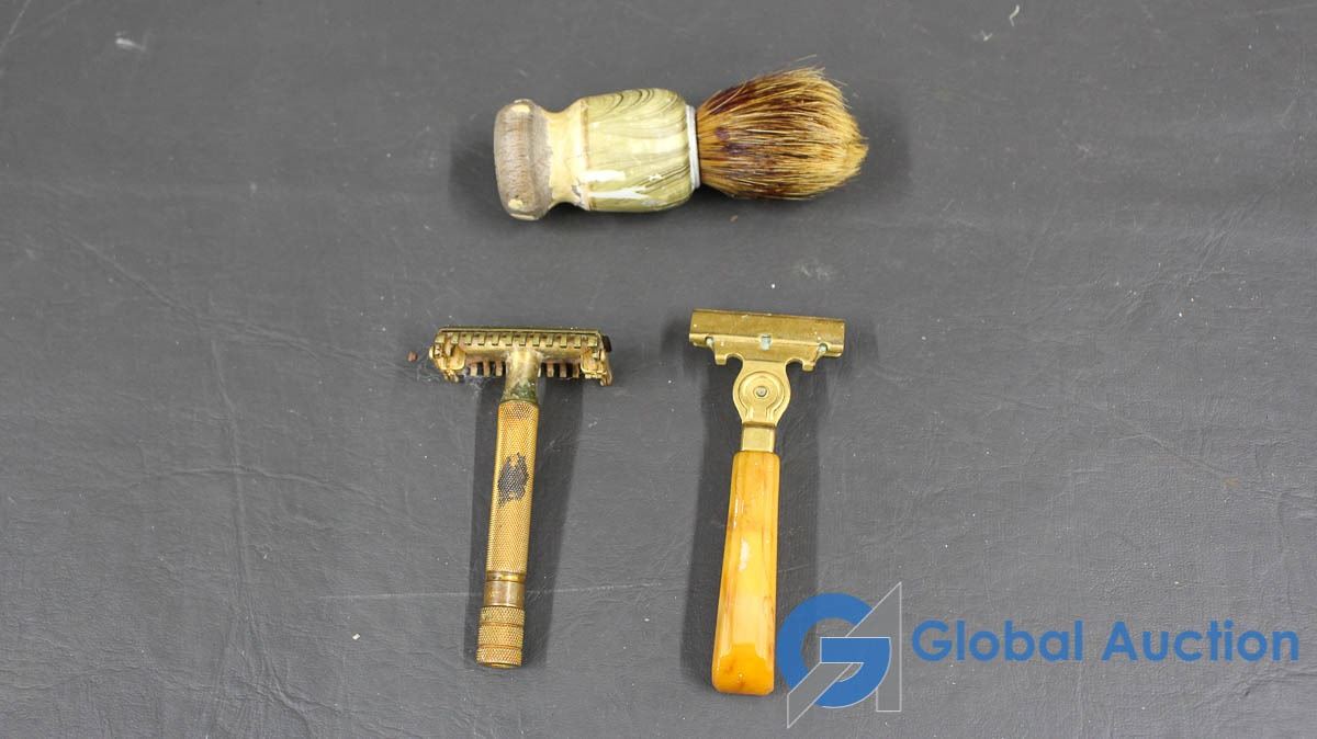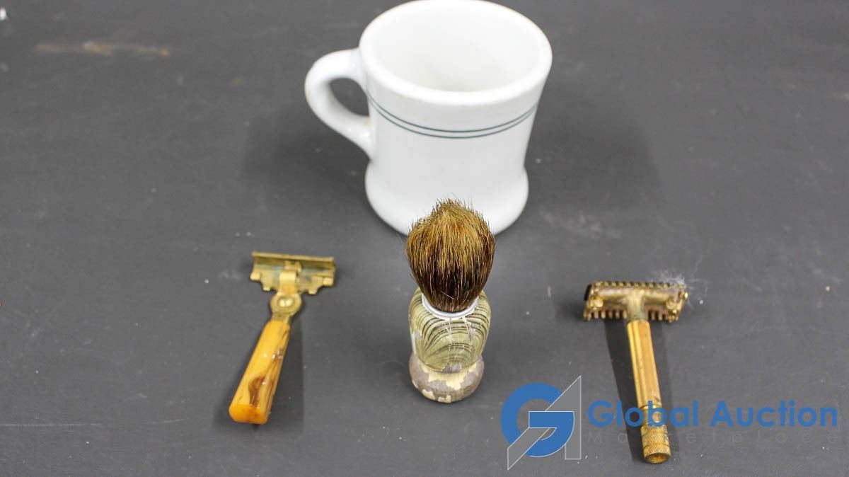 Mug w/2 Vintage Razors and Shaving Cream Brush