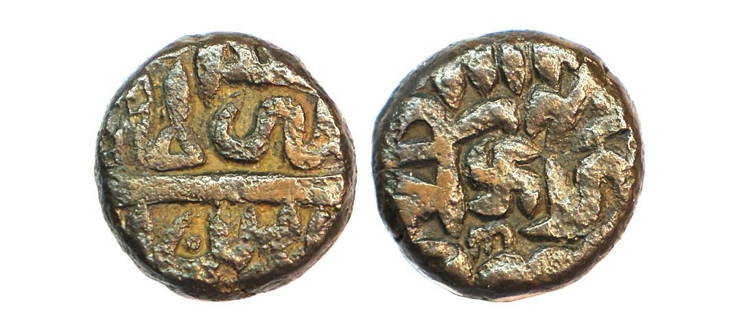 Mughal, Akbar (AH 963-1014, 1556-1605 AD), Copper Dam, 9.84 gms, Mangarh Mint, swastik as a mintmark on obverse, Suri style legends, fine+, very scarce.