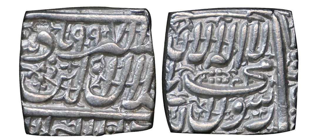 Mughal, Akbar (AH 963-1014, 1556-1605 AD), Silver Square Rupee, 11.40 gms, Dar ul-Sultanat Ahmedabad Mint, AH 997, Kalima type, KM # 82.1, extremely fine, scarce.
