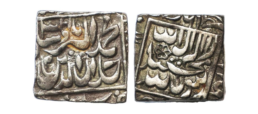 Mughal, Akbar, Silver Square Rupee, 11.08g, Bang Mint, AH 1013(Retrograde Date), Kalima type (KM A86.1). Exetremely Fine. Very Rare, Retrograde Date first time seen in Bang Mint.