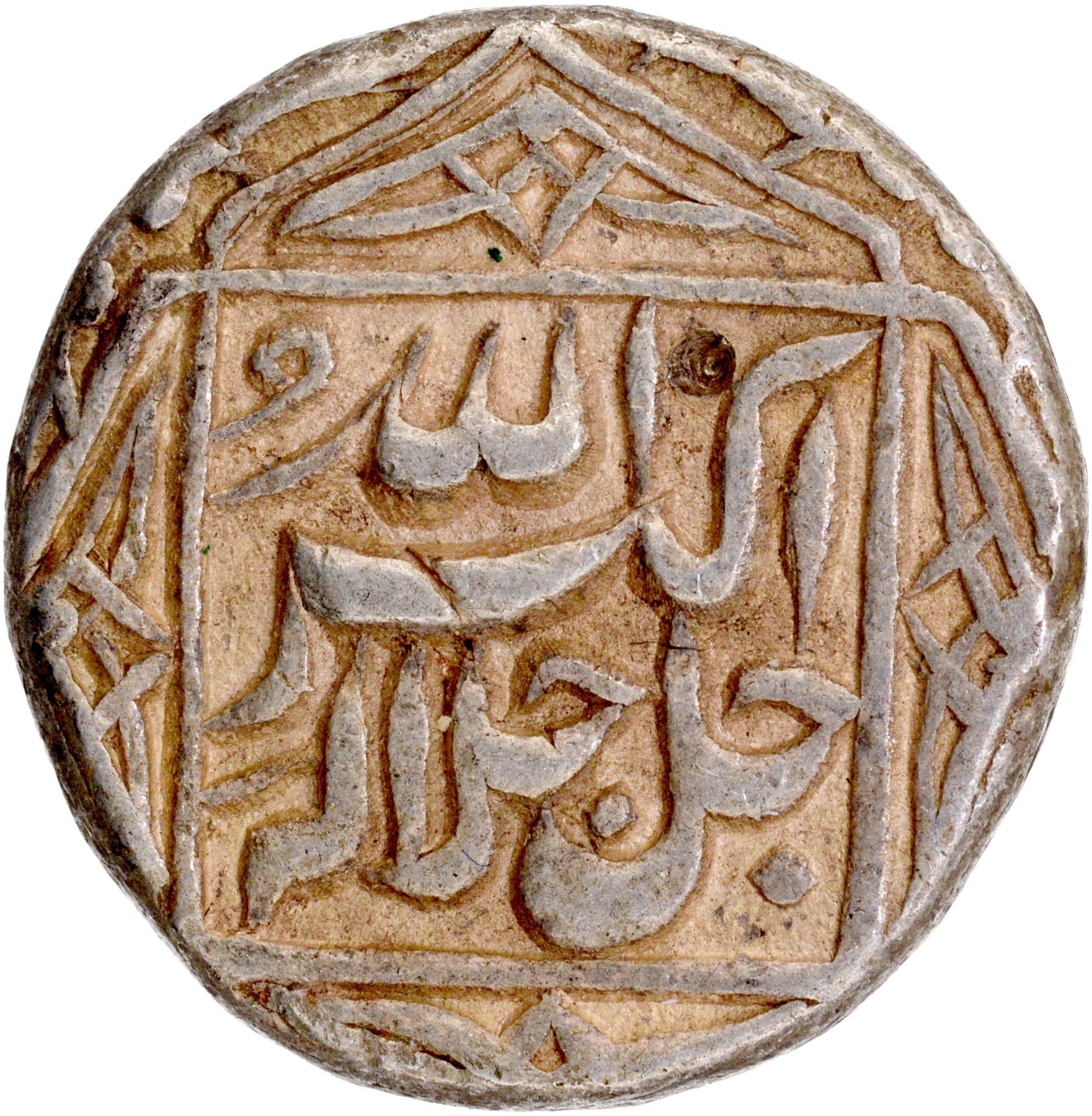 Akbar (AH 963-1014/1556-1605 AD), Lahore Mint, Silver Rupee, Month Farwardin (Aries), Elahi 48, Obv: Arabic legend Jalla Jalalahu Allahu Akbar in the lozenge star, Rev: Persian legends month Farwardin at the top, zarb Lahore Elahi 48 at the bottom in the lozenge star, 11.37g, 20.28mm, (KM # 94.3), test marks, lovely quality, about extremely fine, Scarce.