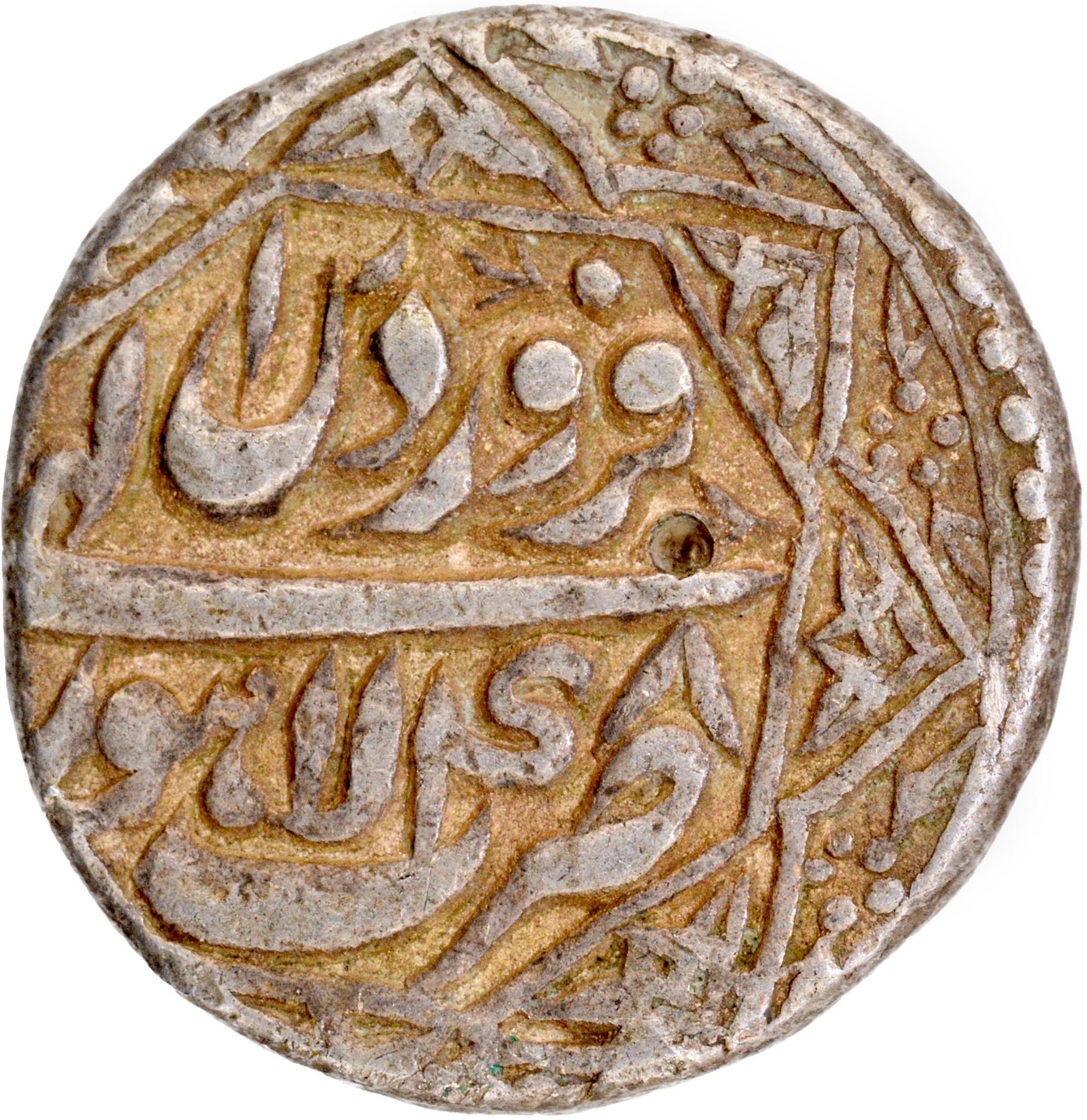 Akbar (AH 963-1014/1556-1605 AD), Lahore Mint, Silver Rupee, Month Farwardin (Aries), Elahi 48, Obv: Arabic legend Jalla Jalalahu Allahu Akbar in the lozenge star, Rev: Persian legends month Farwardin at the top, zarb Lahore Elahi 48 at the bottom in the lozenge star, 11.37g, 20.28mm, (KM # 94.3), test marks, lovely quality, about extremely fine, Scarce.