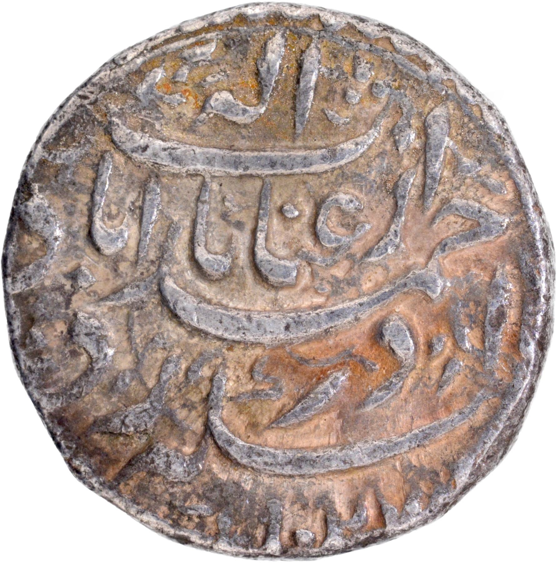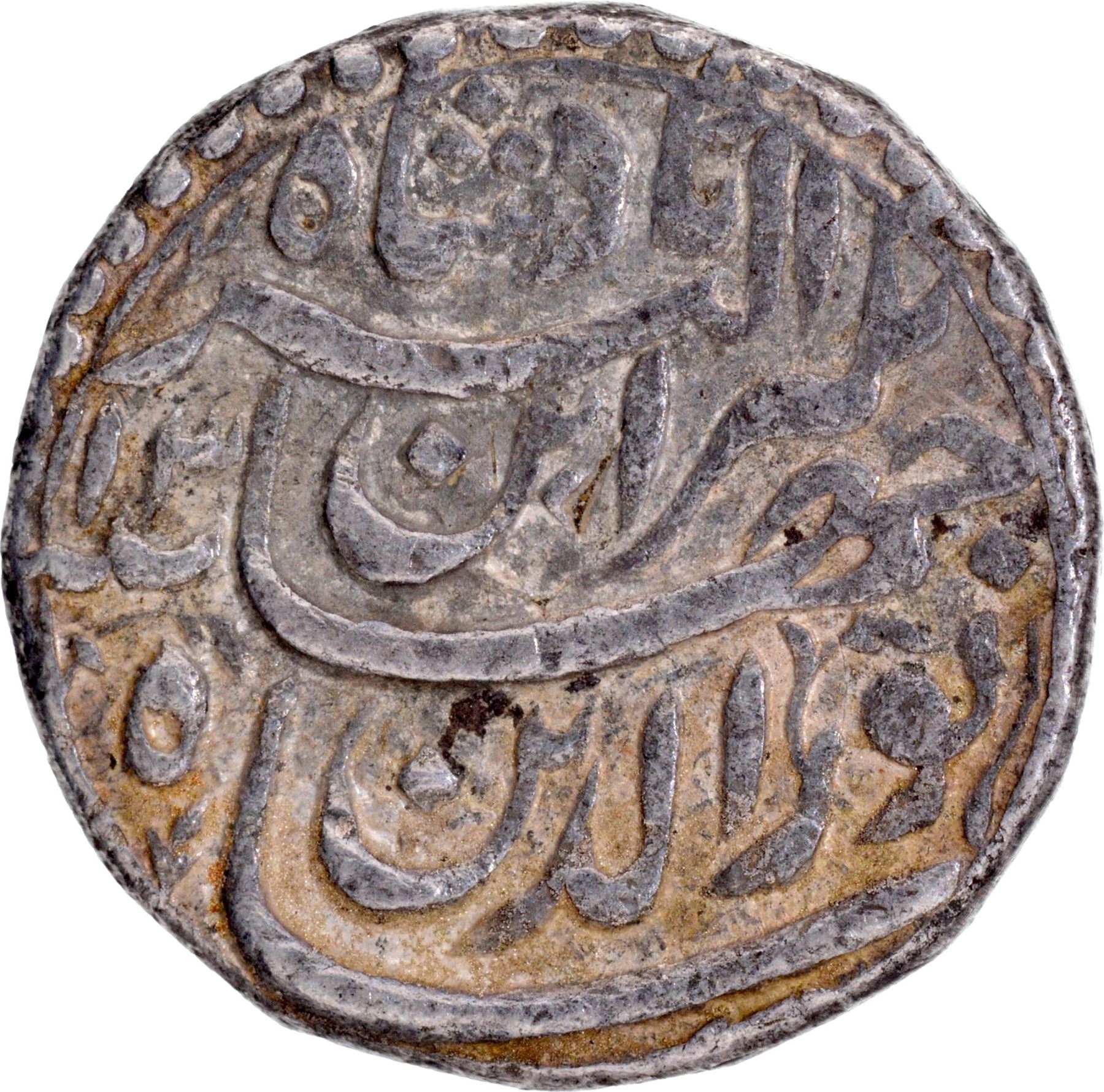 Jahangir(AH 1014-1037/1605-1627 AD)Ahmadabad mint, Silver Rupee,AH 1027/13 RY,Inayat ElahCouplet,Obv: Persian legend Sikka zad dar Ahmadabad zeInayat Elah, Rev:Persian legendShah Noor ud din ibnAkbar Badshah with Hijriyear,11.26g 21.61mm,(KM #149.4), notest marks,about extremely fine,Scarce.