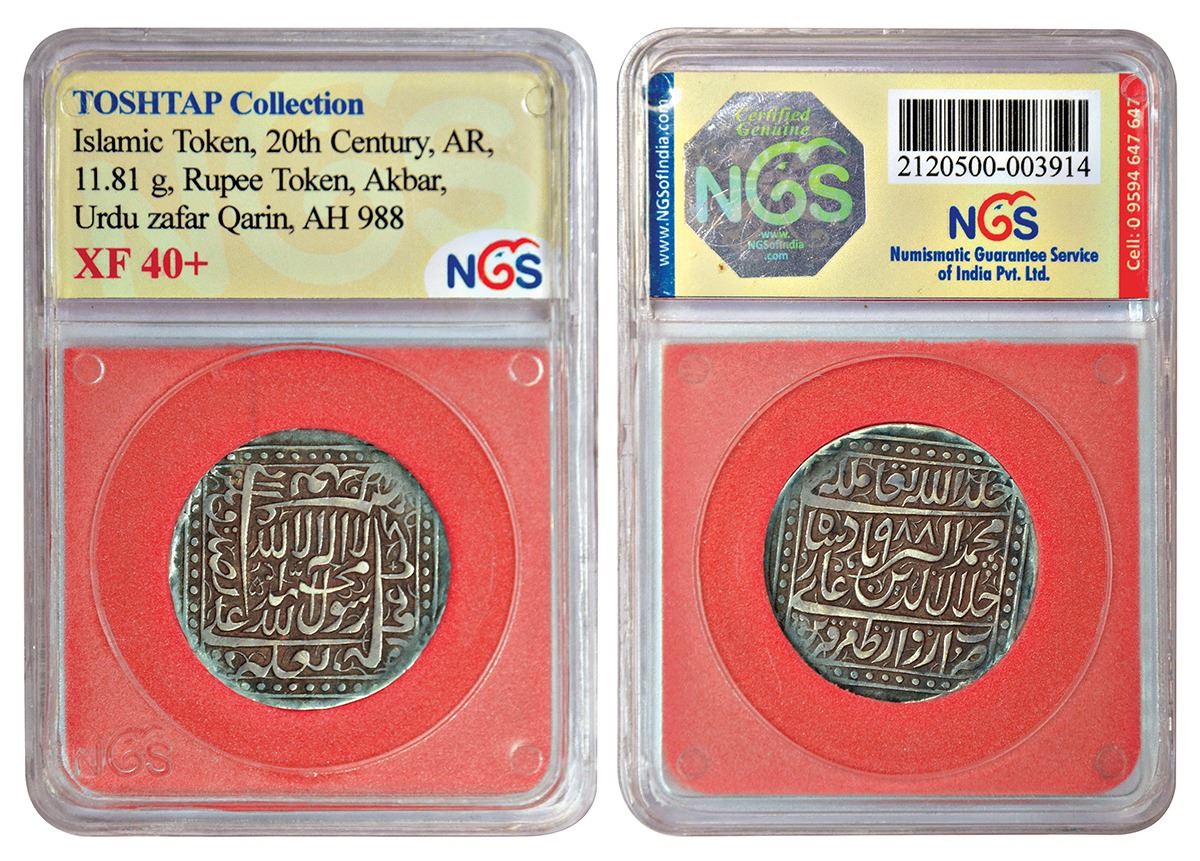 Mughal religious token of Akbar (20th century AD). Obv: Kalima within dotted circle. Rev: legend Jal Jalal ud din Muhammad Akbar badshah, AH 988, Zarb Urdu Zafar Qarin within dotted square.