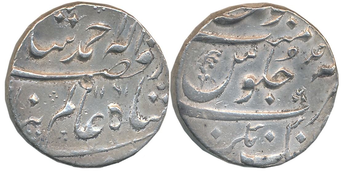 Ahmad Shah, Silver Rupee, 11.43g, “Alam Panah” Couplet, Aurangnagar Mint, AH 1161/ RY Ahad, almost complete Mint name on bottom of reverse (KM# 446.19). About very fine, rare.