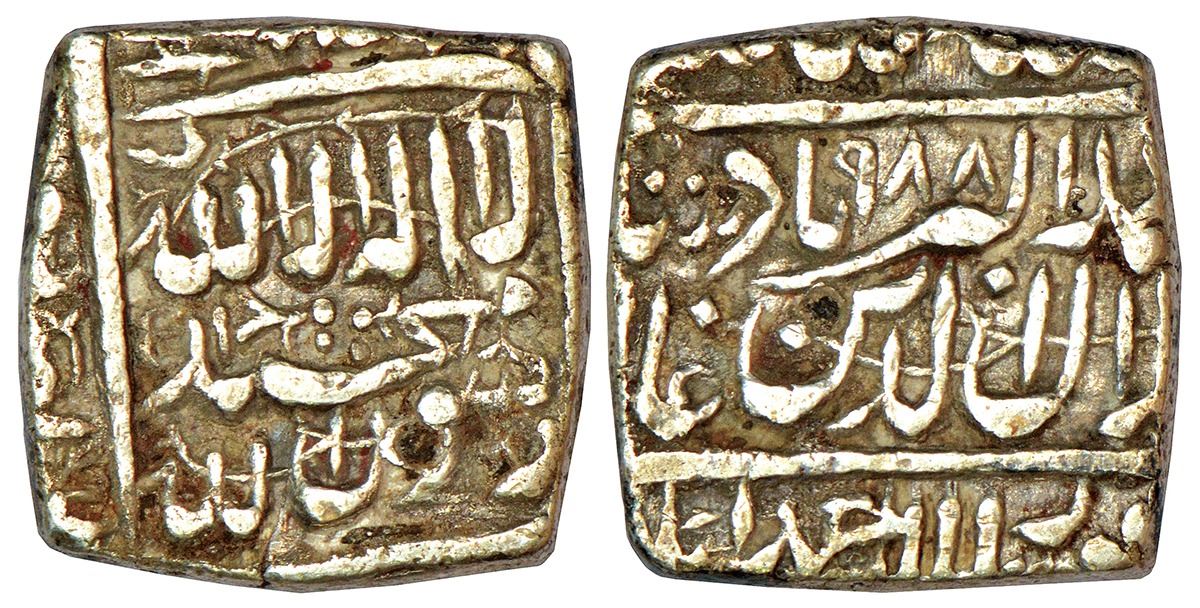 Akbar (1556-1605 AD), silver square rupee, Dar us-Sultanat Ahmadabad mint, AH 988, KM 82.1, 11.21g.