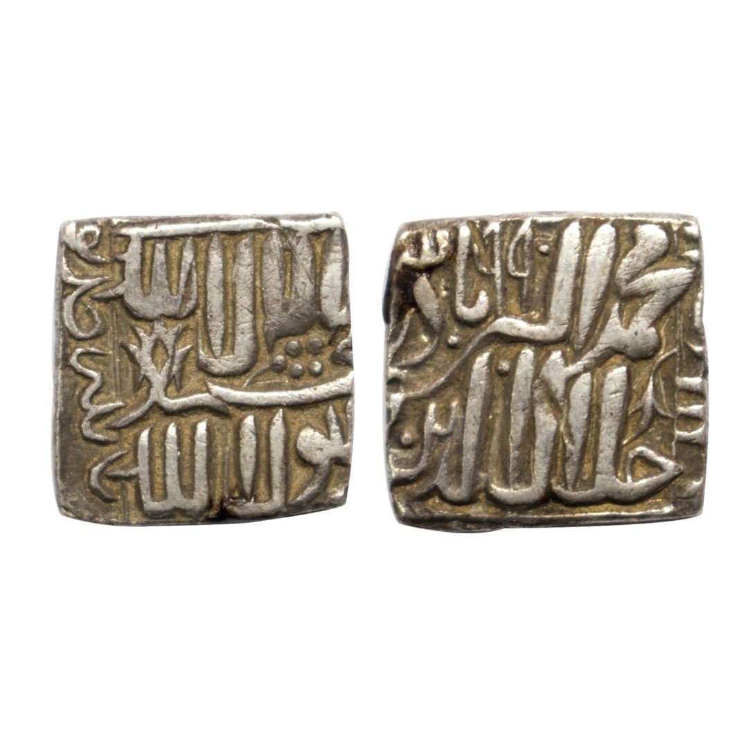 Mughals, Akbar (AH 963-1014 / 1556-1605 AD), Silver Square Rupee, 11.16 grms, Bang Mint (Bengal Province), AH 990, Kalima and Jhar privy mark at end of Muhammad on obv., crude legend on both sides. (KM # 86.1). Very Fine+