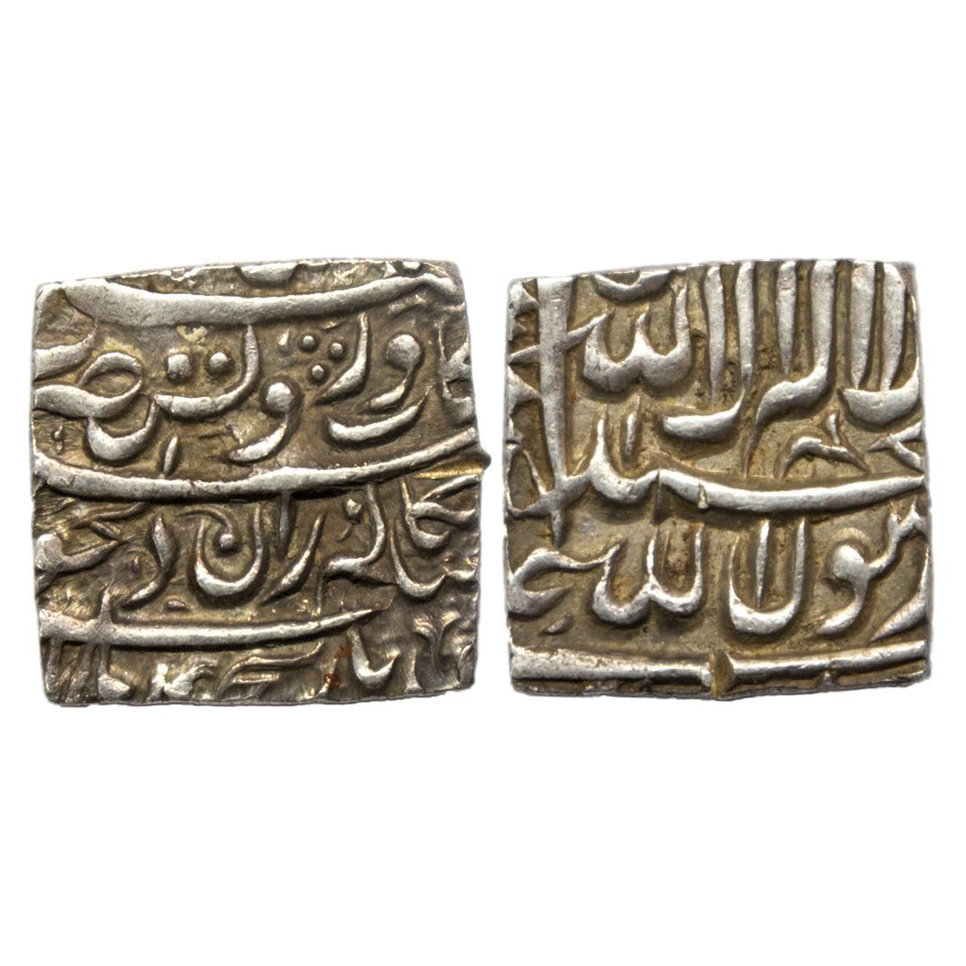 Mughals, Akbar (AH 963-1014 / 1556-1605 AD), Silver Square Rupee, 11.40Grms, Bangala Mint, OBV: Kalima, REV: Poetic couplet read as ‘Sikka-e-Bangala zan dilkhwah shud, Kaab-e-Roshan zarb Akbar Shah shud’. (KM # 86.1).
