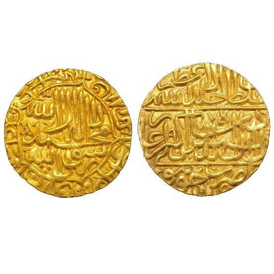 Akbar, Gold Mohur, 10.86g, Dar ul-Khilafat Jaunpur Mint, obv. Kalima within enclosure, Broad flan, rev. al sultan khallad Allah malkahwatali, Jalal ud -Din muhammad Akbar badshah ghazi, zarbJaunpur 977, complete mint name at bottom (KM 105.4). Superb deep strike, Extremely Fine, Very rare