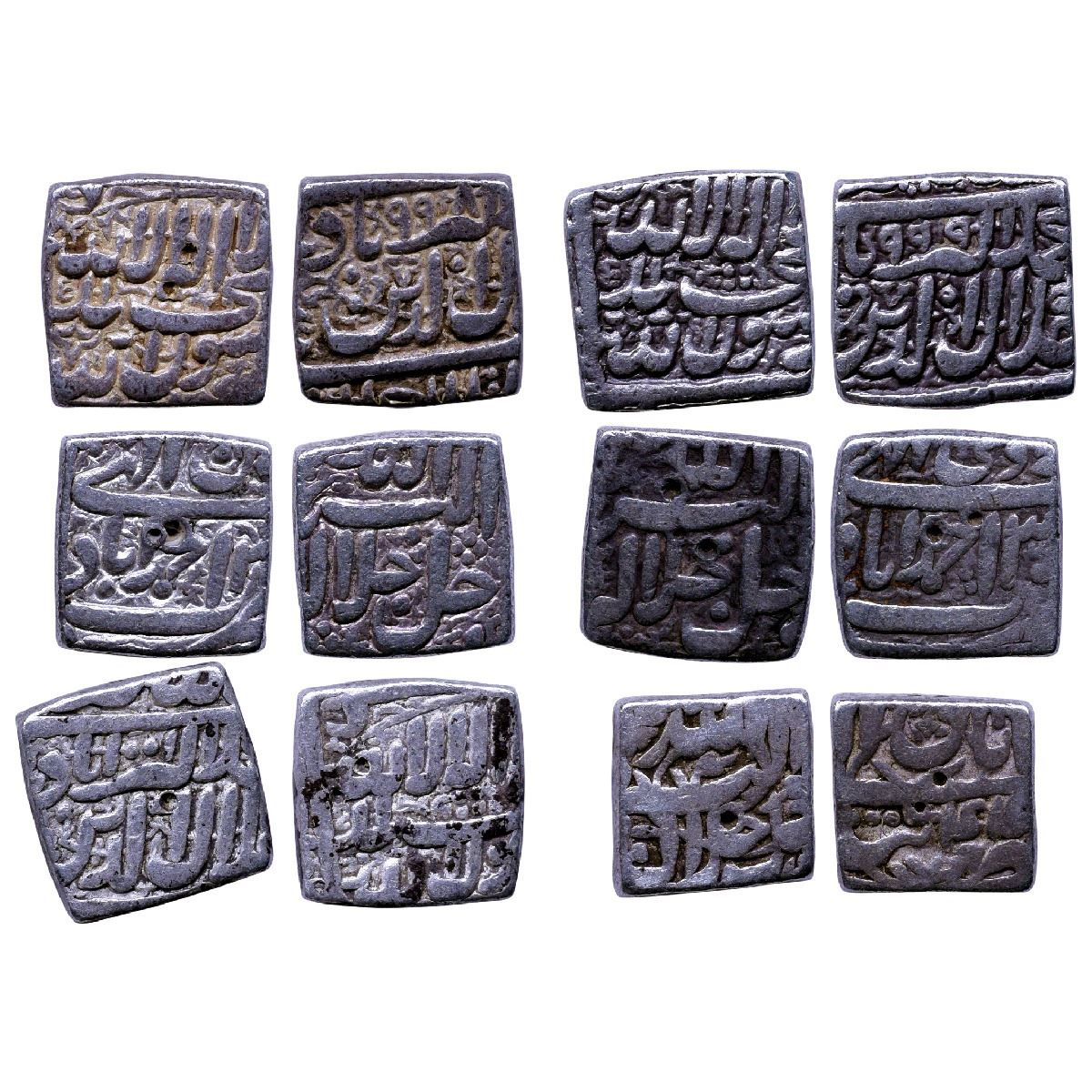 Akbar, Silver Square Rupee, Ahmedabad Mint (5), AH 998, 999 and 1001, Ilahi month Ardibihisht & Bahaman and Tatta Mint (1), Month Aban, Year 44. (KM 82.1, 88.1 & 88.7).Extremely Fine to Very Fine+, Rare.