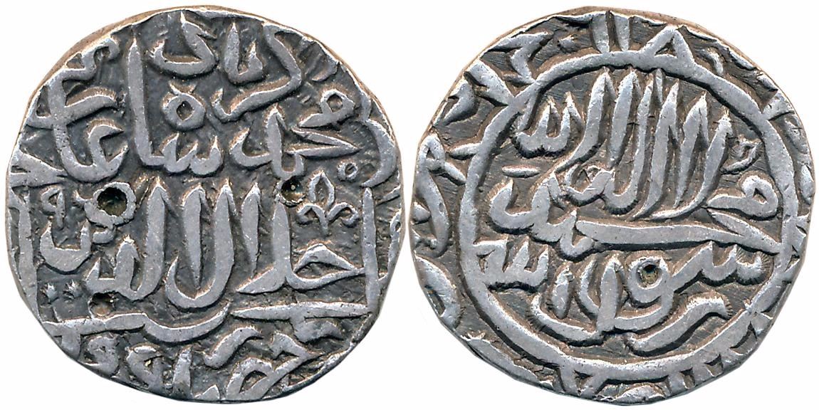 Akbar, Silver Rupee, 11.23g, "Kalima" type, Hisar Firoza Mint, AH 96X (KM# 80.9). Very fine, rare./nlMuch of mint-name visible which is a rare feature for issues of this mint, ‘clover’-like symbol in the lower line of King’s name.