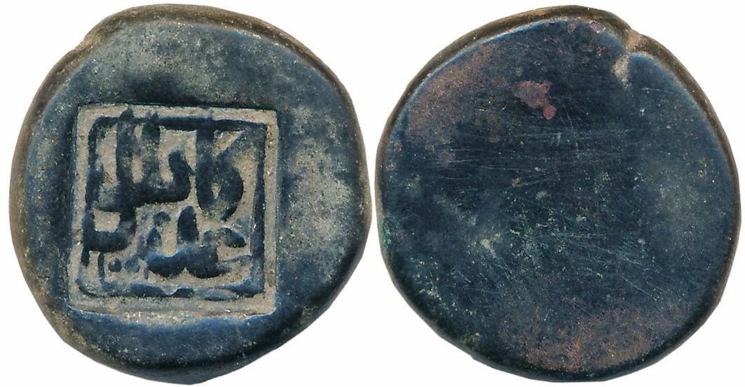 Akbar, Copper Dam, 18.94g, Kabul Mint, Obv: "Adl Kabul" counter struck in a square shaped cartouche, Rev: Traces of legend. Very fine.