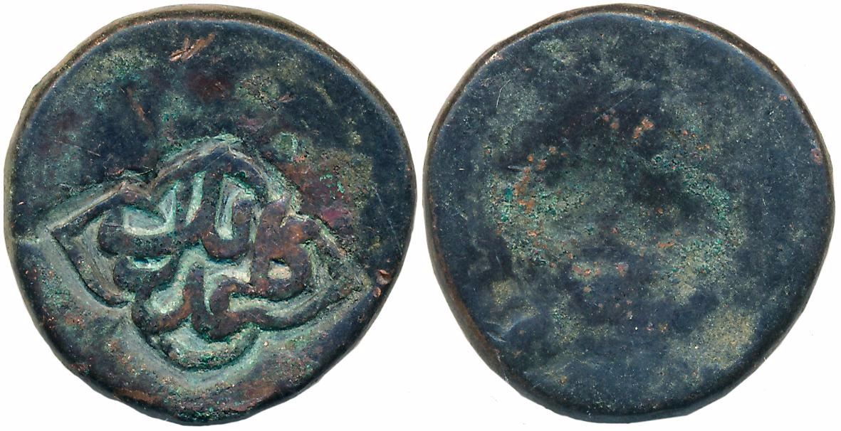 Akbar, Copper Dam, 19.28g, Kabul Mint, Obv: "Adl Kabul" counter struck in a square shaped cartouche, Rev: Traces of legend. Very fine.