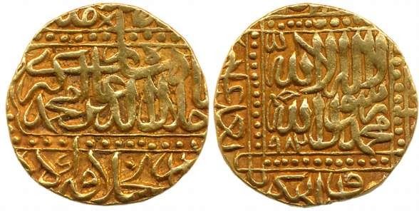 Akbar, Gold Mohur, 10.86g, “Kalima” type, Dar ul Khilafat Agra Mint, AH 982, Obv: Legend within dotted rectangle, Rev: Legend within dotted square (KM# 108.1). Very fine, rare.