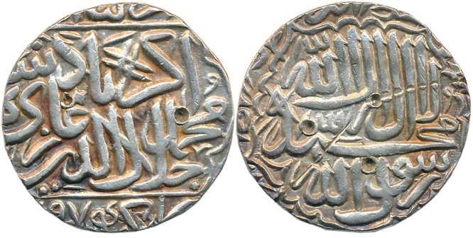 Akbar, Silver Rupee, 11.24g, Akbarpur Tanda Mint, AH 974, characteristic ‘criss-cross’ symbol, with the emperor’s name in a ‘mihrab’-shaped cartouche (KM# 80.3). Very fine+, rare.