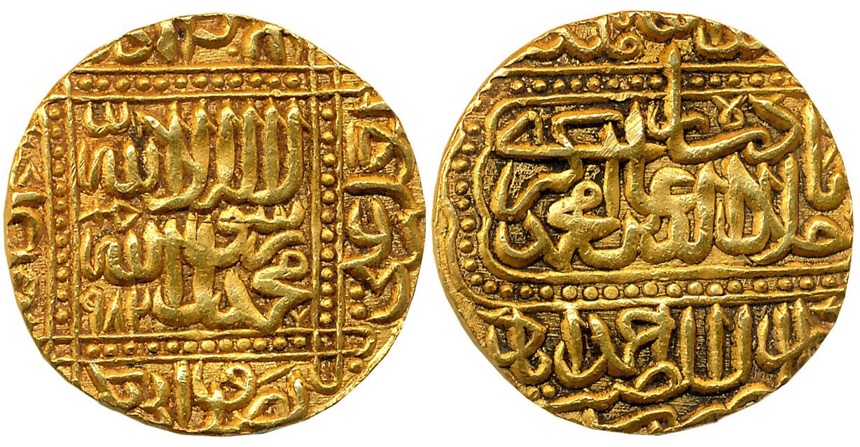 Akbar, Gold Mohur of 9 Rupee Value, 10.88g, Broad Flan, “Kalima” type, Dar ul Sultanate Ahmedabad Mint, AH 982, Obv: Shahada in dotted rectangle with AH date, names and titles of four Rashidoon caliphs in margins, Rev: Full name of the emperor in a mihrab-shaped cartouche, invocation “Khallada Allah Mulkhu” above and mint-name below. Complete Mint name on bottom of reverse. Extremely fine, very rare.