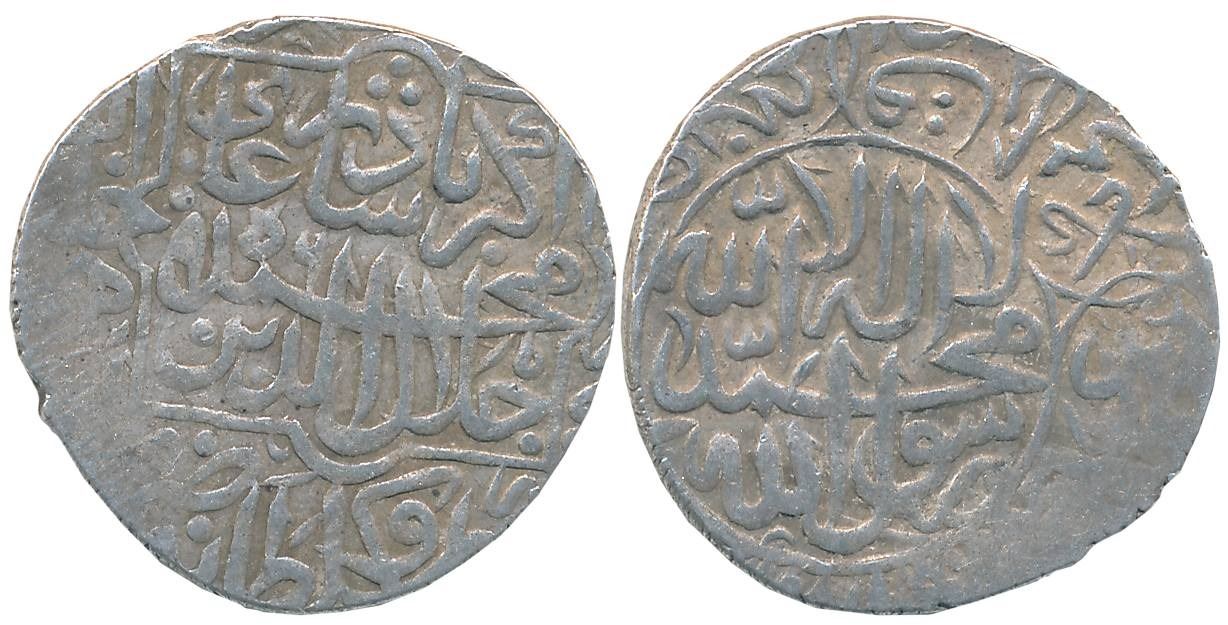 Akbar, Silver Shahrukhi / Mithqal, 4.76g, Hazrat Delhi Mint, AH X6X, Obv: Kalima in circular cartouche, names and titles of Rashidoon Caliphs around, Rev: Akbar’s full name in a Mihrab-shaped cartouche, Khallada Allah invocation and mint-name (partly visible) in margin. Very fine, rare.