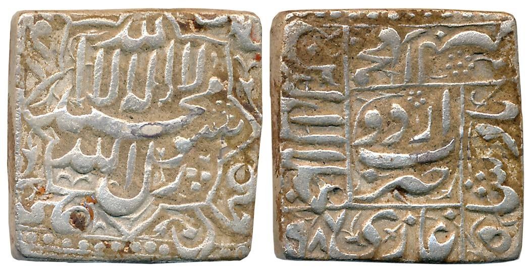 Akbar, Silver Square Rupee, 11.17g, Kalima type, Urdu Mint, Obv: Kalima within a lotus-shaped cartouche and names of the Khalifas in bottom and top corners, Rev: Mint name in centre within a square with legend “Jalal ud-din Muhammad Akbar Badshah Gazi” written around. Extremely fine, extremely rare.